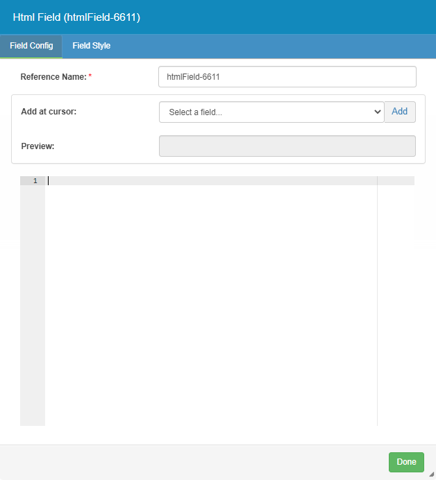 Add at cursor – Users can select field data which will be inserted into the code.