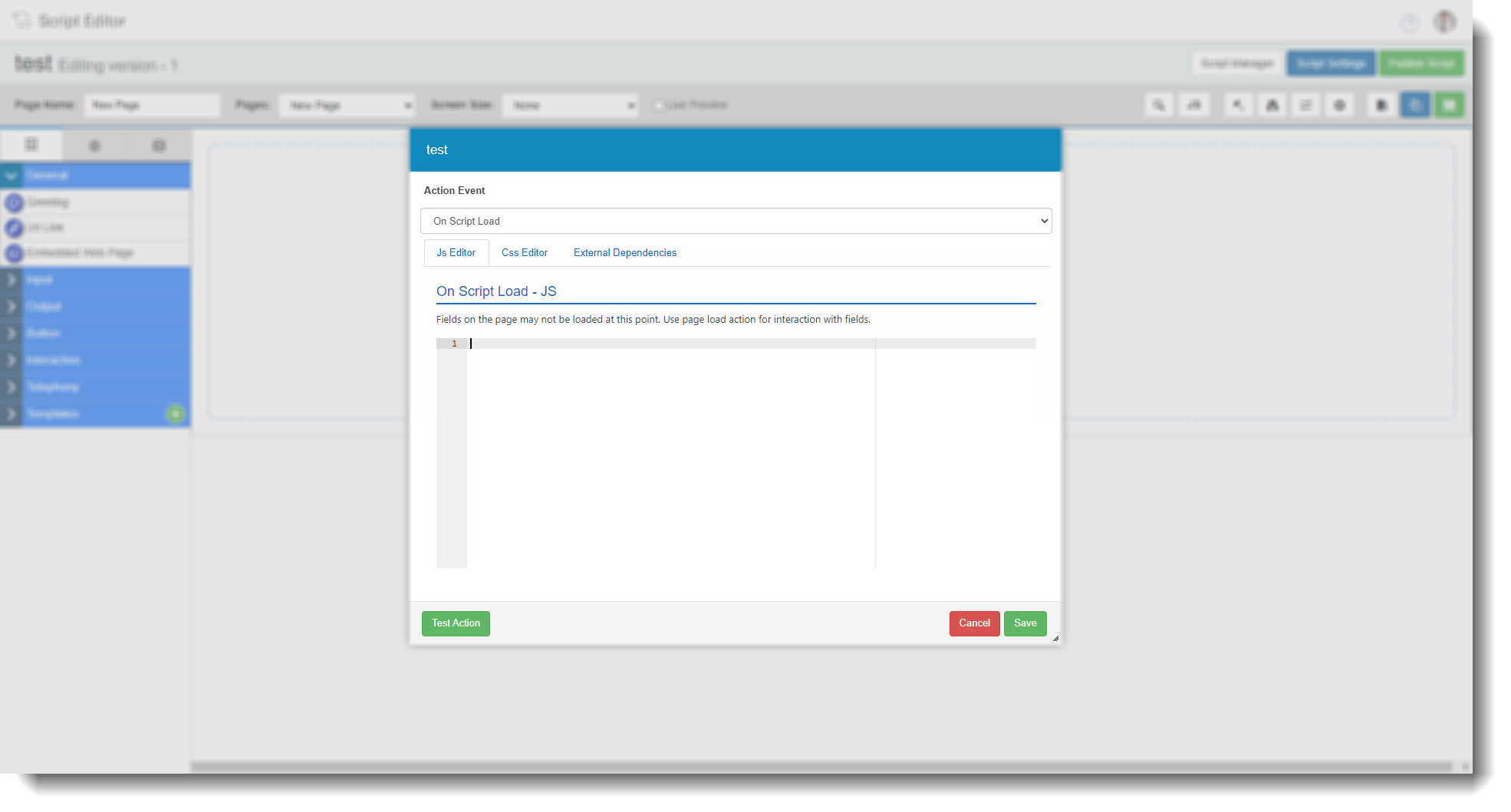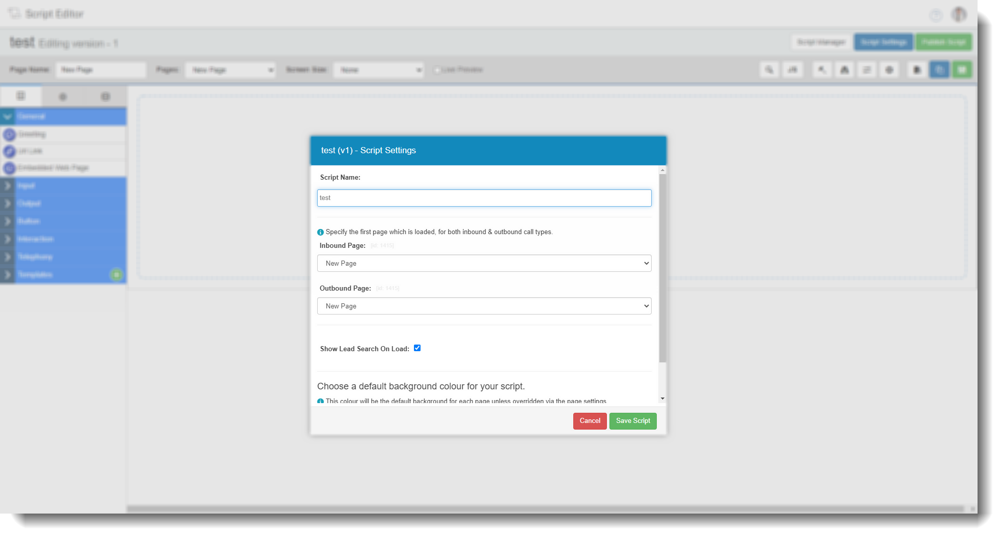 | Script settings | Clicking here will open a dialog box where users can edit the script name, specify the first page loaded for inbound and outbound calls and choose a default background colour for the script. ![]() |