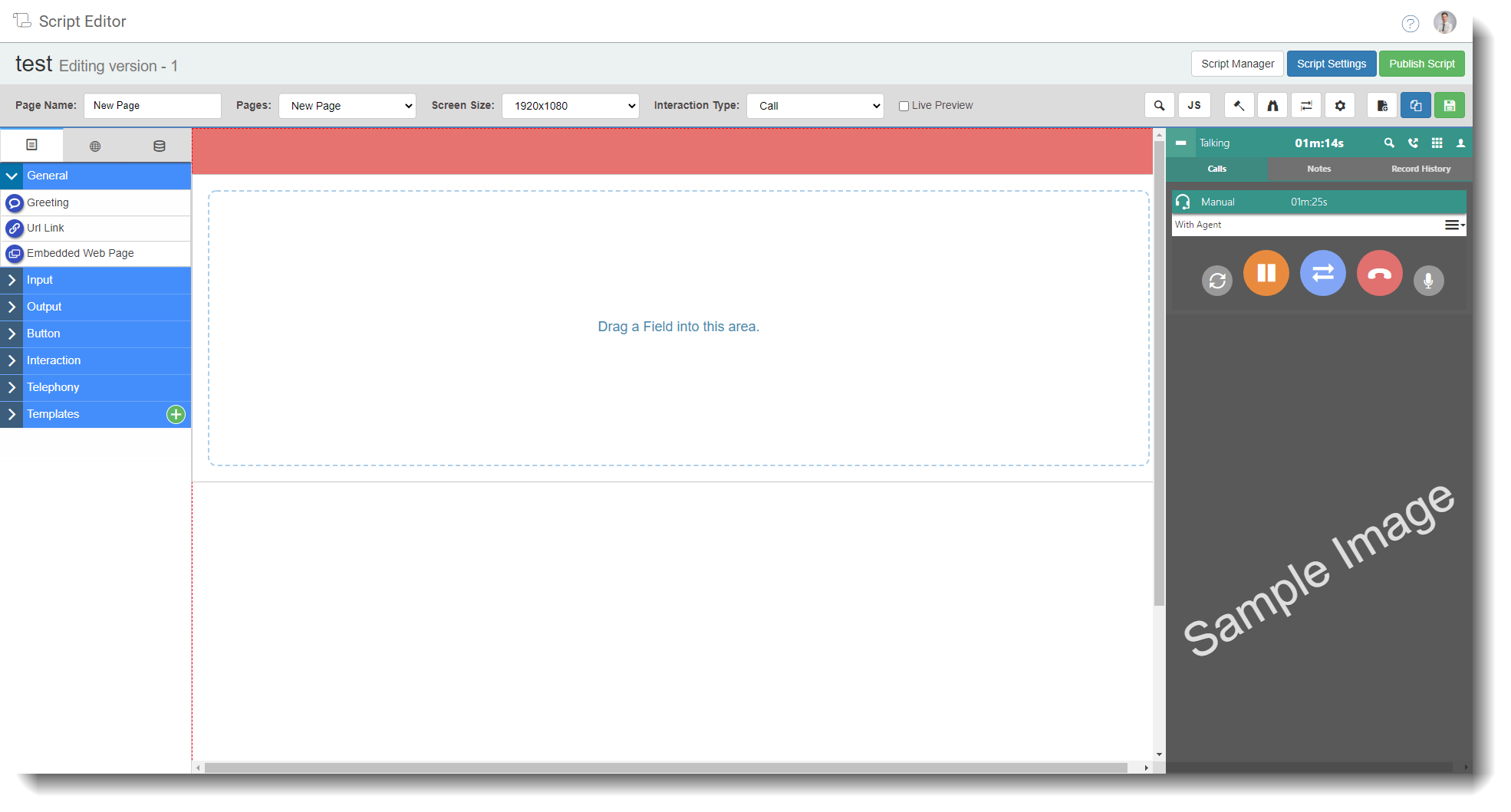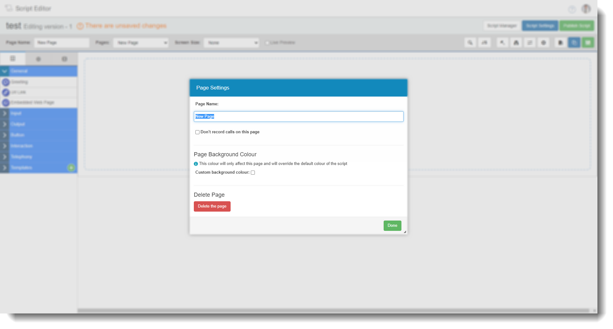 ![]() | You can change a pages name, select whether to record calls or not on a certain page and you can change the background colour. You can also delete the page of the script here.![]() |