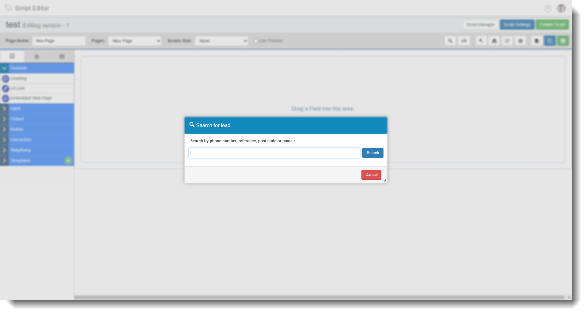 ![]() | Searching for a lead will allow you to see what information will look like when used in the scripting process of a call. Once you have clicked the search button, you can type in a phone number, reference, post code or name and search based on that. Once the results of the search have come through, clicking a lead will take you back to the scripting editor and any information on fields will be populated with information from the lead. |