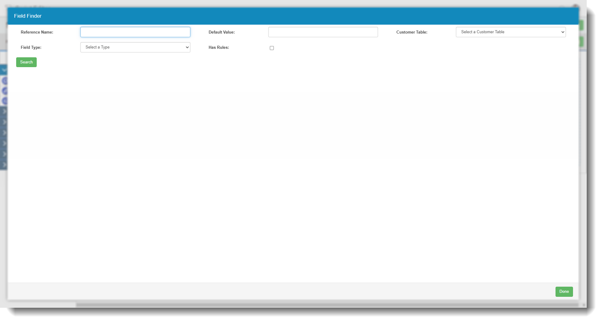 ![]() | Here, you can search for fields within your script in various ways. Reference name. You can enter a Field reference to search for. Default value. You can search by the default value of a field. Customer table. You can search by customer table here. Field type. You can select the field type from the drop down (which contains all types). Has rules. You can search by whether the field has rules or not by checking or unchecking this. |
