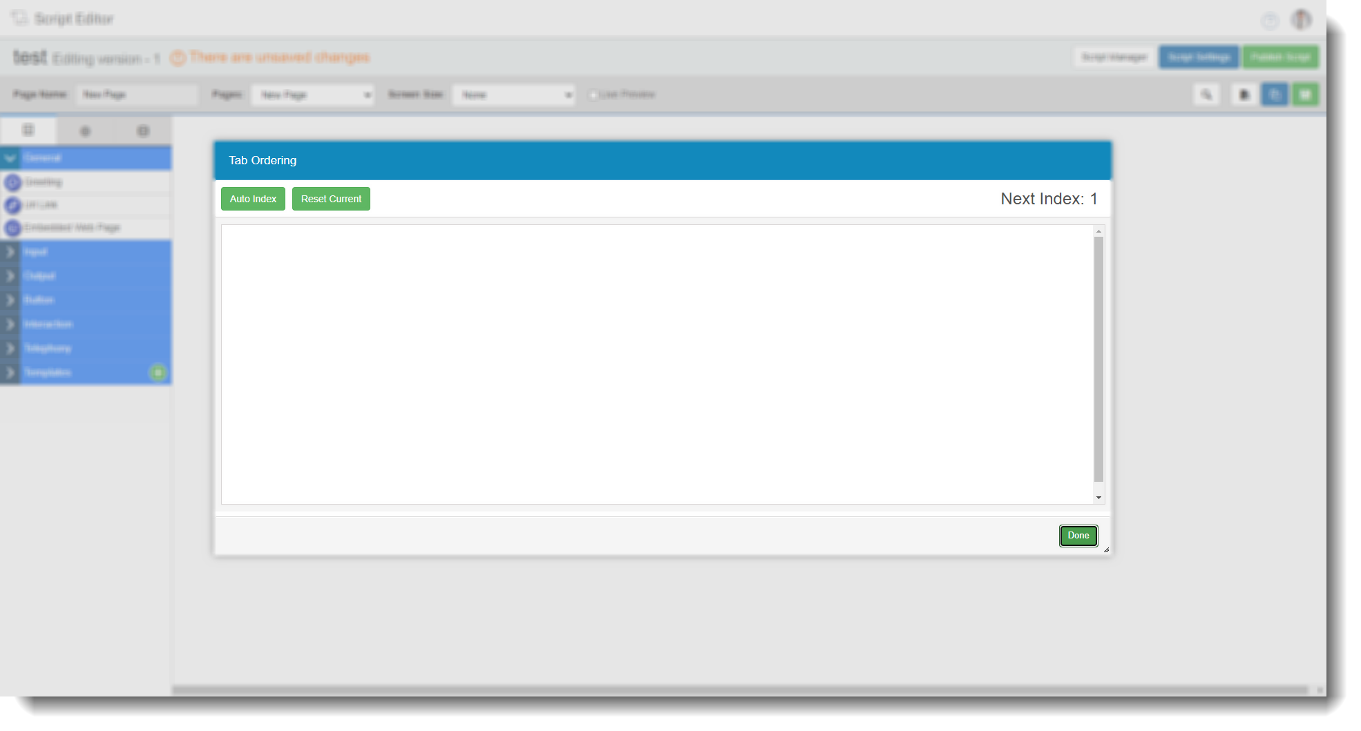 ![]() | When users are on a script, they can use the 'Tab' button of the keyboard to move through the fields. Tab Ordering allows you to set the order of the fields that tabbing will move through.![]() |