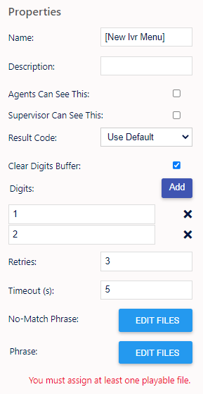 Digits (Add)- Clicking here will add a digit for the customer to select e.g. 'Press 1 for sales'. You can add up to 10 digits ranging from 0 - 9. Digits can be edited by selecting them on the right (Limited to one character per digit). They can also be deleted by clicking the X next to them.