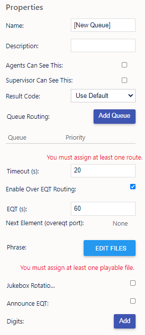Enable Over EQT Routing - Checking this will move the customer down the 'over EQT' route. This puts them into a different element such as a message to say 'leave a number for a call back'.