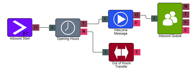 The example below has a blackout days element before the opening hours time check which checks for bank holidays. When a caller enters the inbound IVR, if the configured dates match on the bank holiday the call will route to a pre-recorded message specific for the bank holiday. On any other date that does not match what we have configured, the call follows the No Match (N) route and links into the standard IVR.
