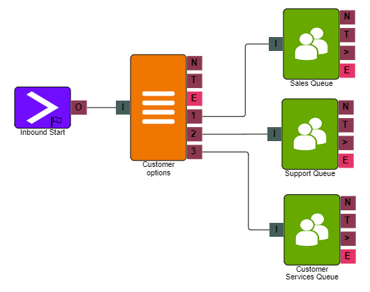 The example below simply provides the customer with the choice of routing to the sales, support or customer services queue by selecting1,2 or 3 on their keypad.