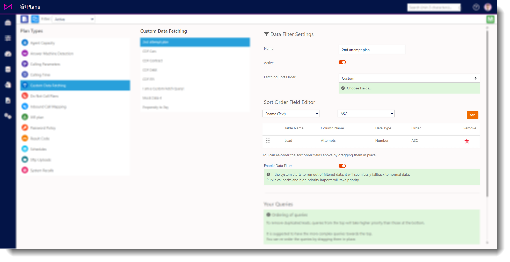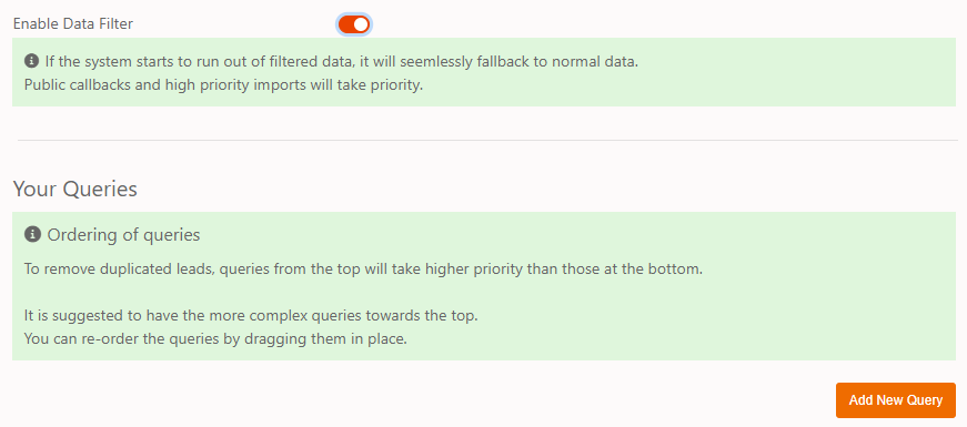 The ordering is important as it is possible to create multiple queries that could potentially fetch the same lead. The ordering prevents this duplication and the query that is highest in the list will be looked at first. If the different queries are focussing on different sets of data (different data tables) then the order isn’t an issue, only when you use the same data table or no data table at all.