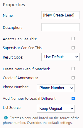 The Create Lead IVR element allows for the immediate creation of a Lead from a call which may or may not have a lead associated or matched to it.