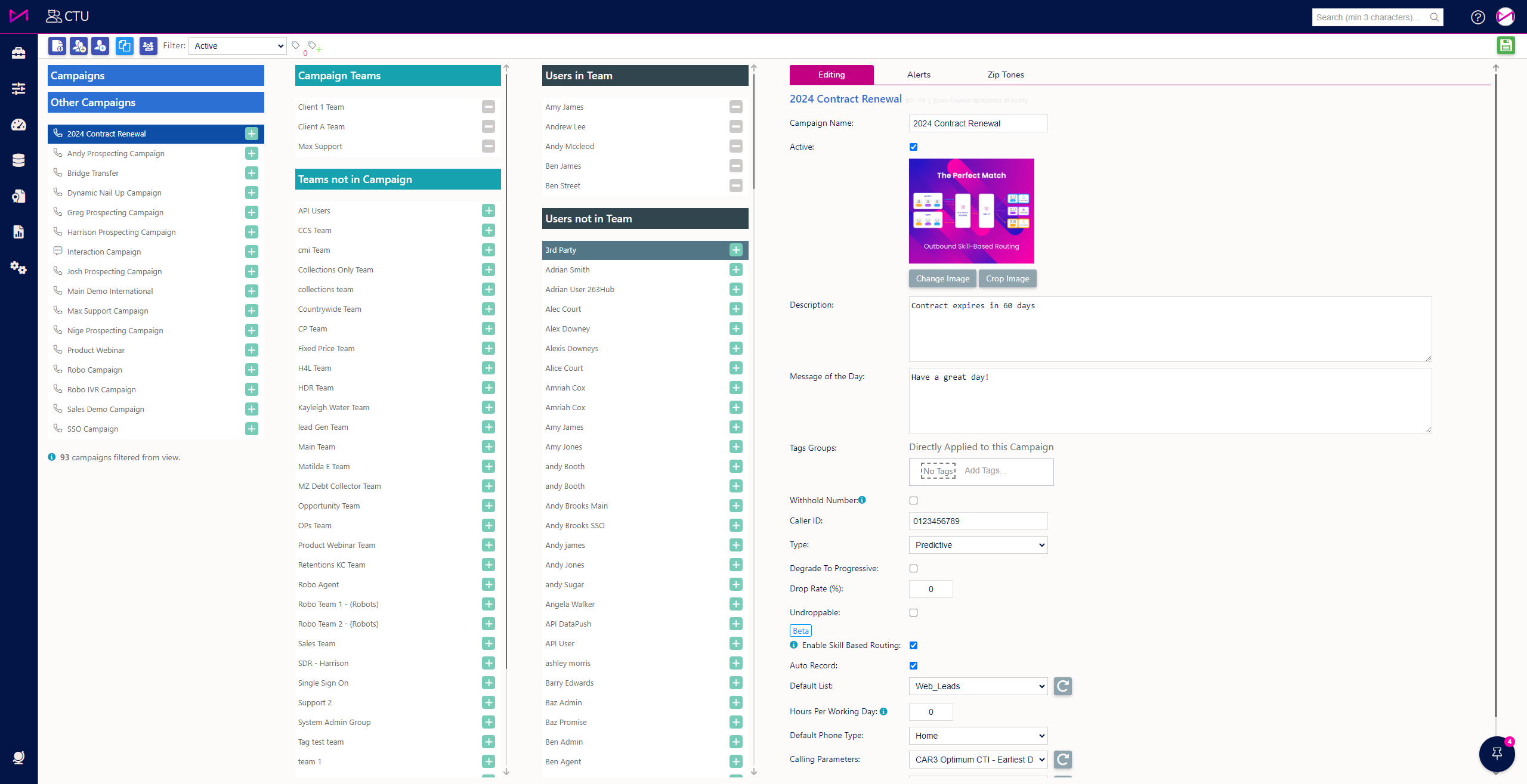 To add a tag to a campaign, users need to select a campaign (1) from the CTU Admin page. When the campaign is selected, on the right-hand side of the screen (2), the user will see the editing tab populated with the selected campaigns information.