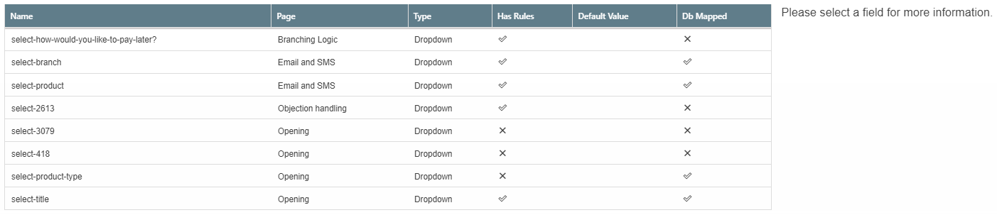 DB Mapped - Tick or Cross to show whether or not this field is mapped to a database field