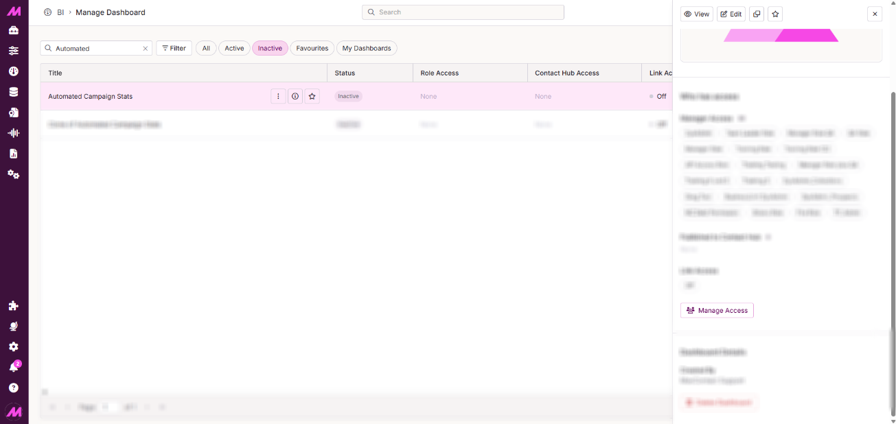 To get started, locate your dashboard in the grid and select Manage Access from the right-hand panel. This will open the Publish Dashboard window, where you can control access across two tabs.