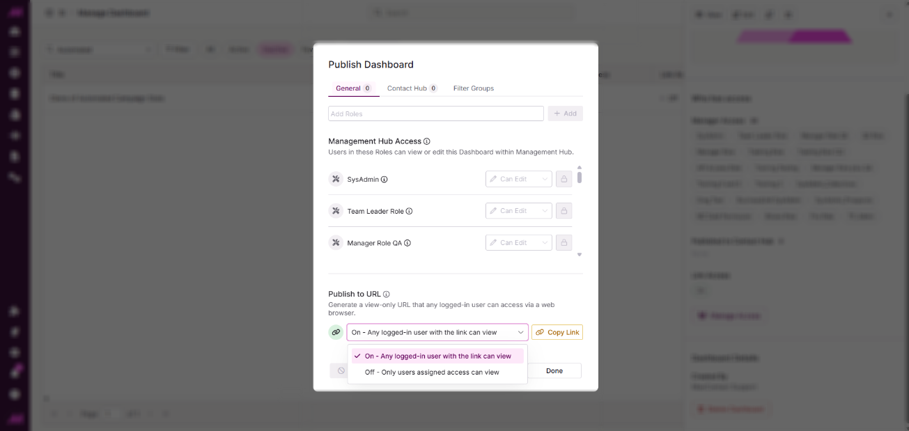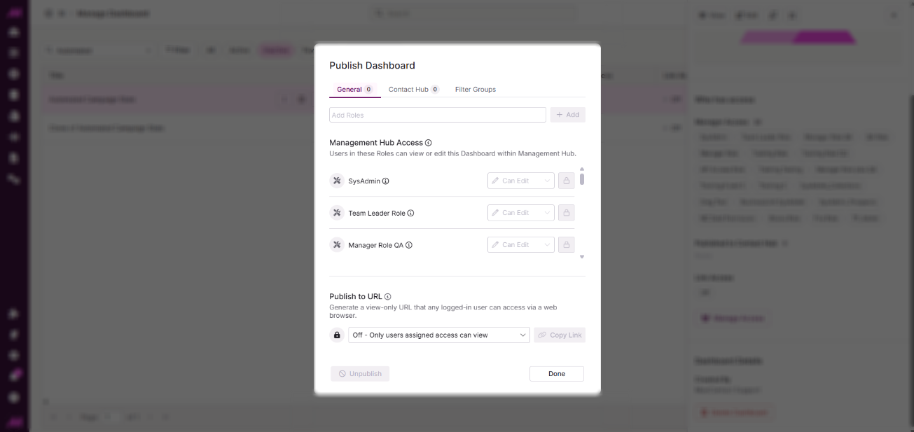 Please note: Any role with edit-level permissions will have access to all dashboards by default. These will appear as locked rows within the publish window and cannot be removed, as access is granted automatically by their permission level.