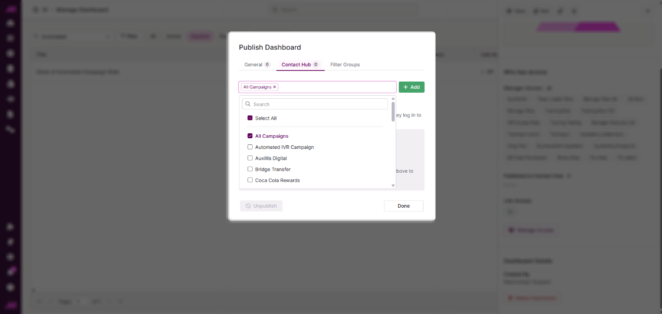 To make a dashboard available within Contact Hub, search for the relevant campaigns within the Add Campaigns field and select those you wish to add. An All option is also available if you'd like to publish the dashboard system-wide across all campaigns.