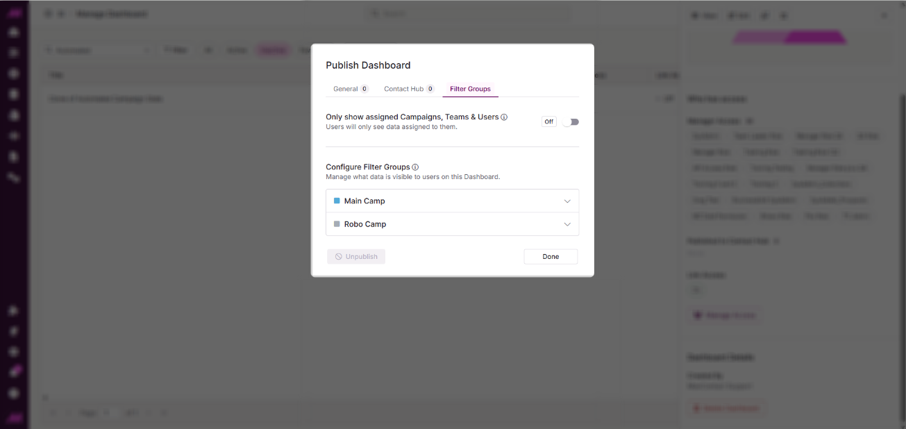 For example, a dashboard could be configured to display data from a single campaign only, or restricted to show specific team information by unchecking Allow Campaign Selection, List Selection and User Selection - meaning users can only adjust the Teams filter.