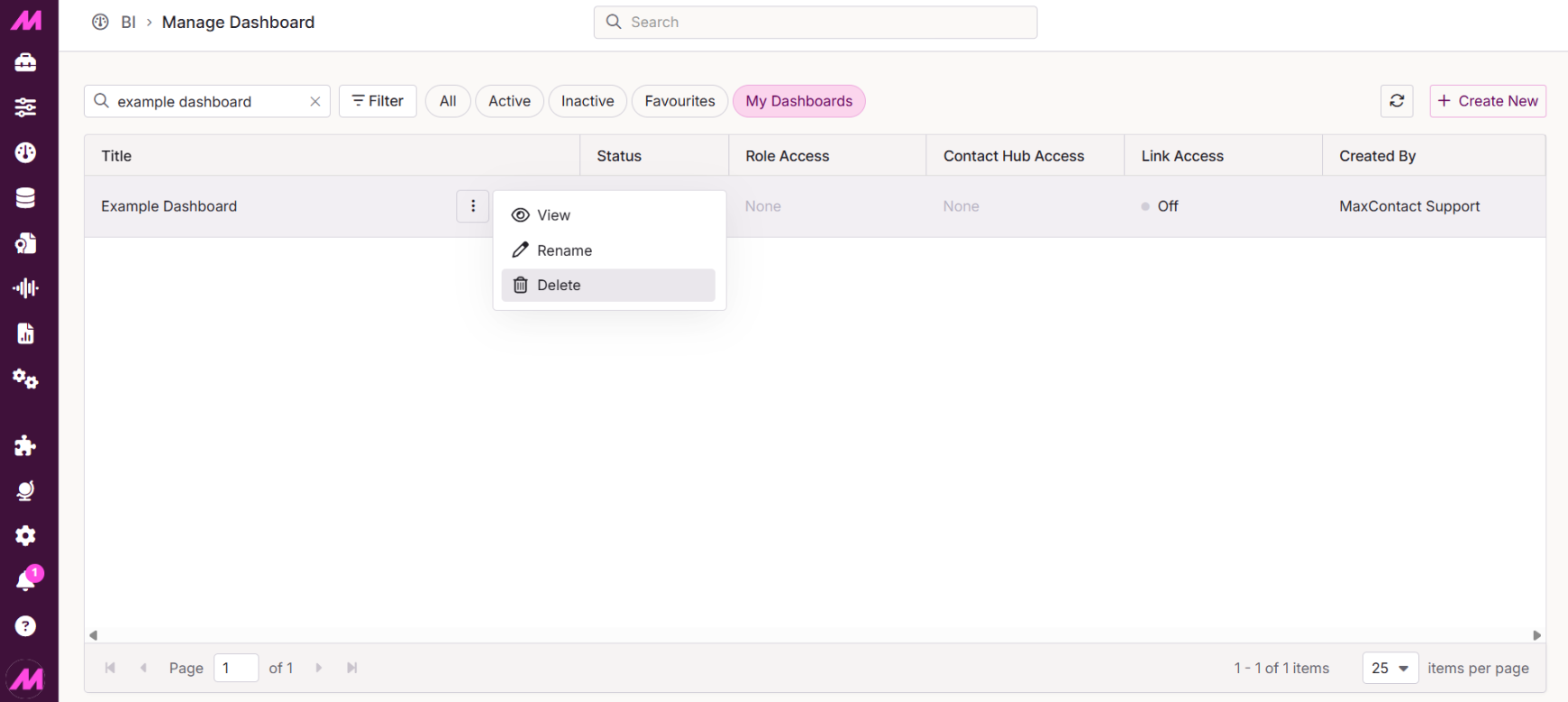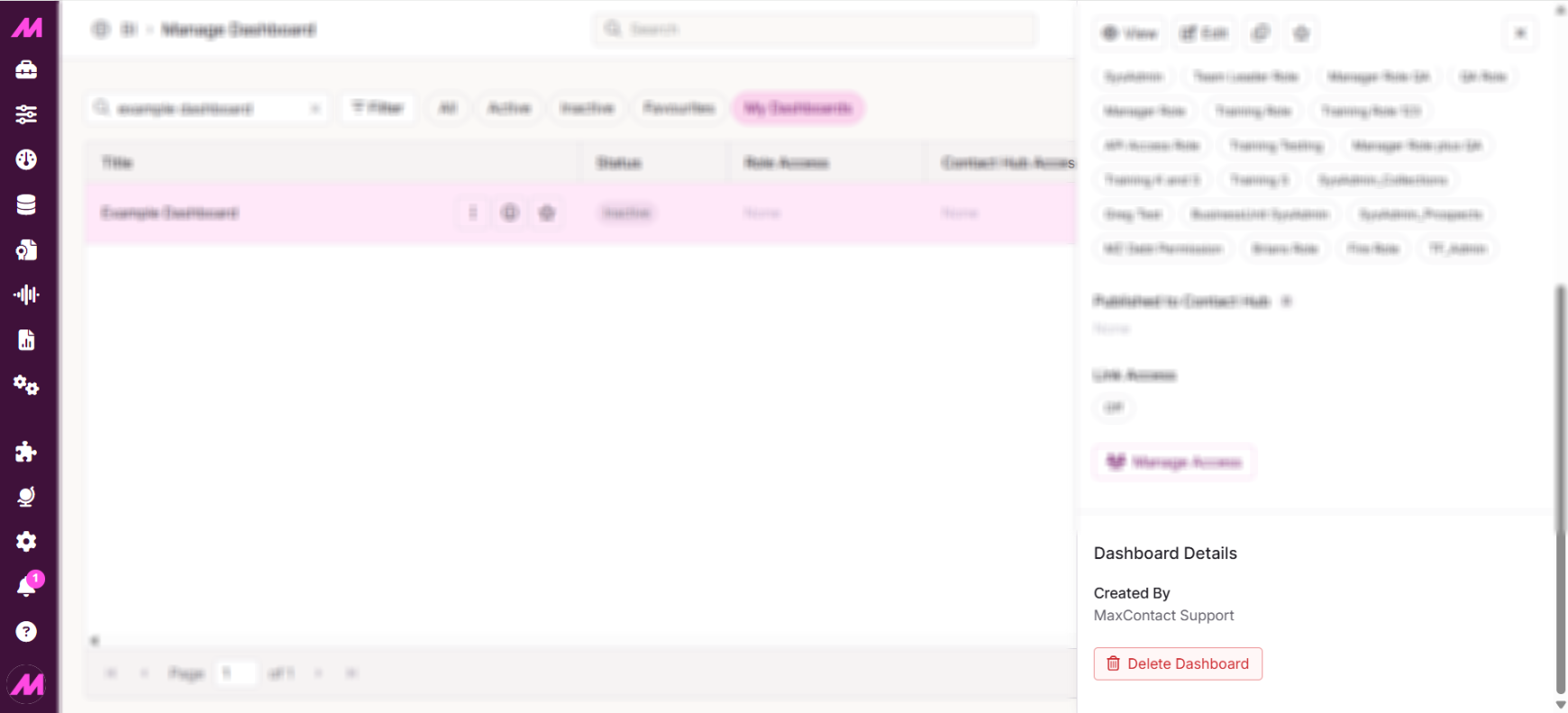 - Open the Dashboard Manager and locate the dashboard or wallboard you want to delete.