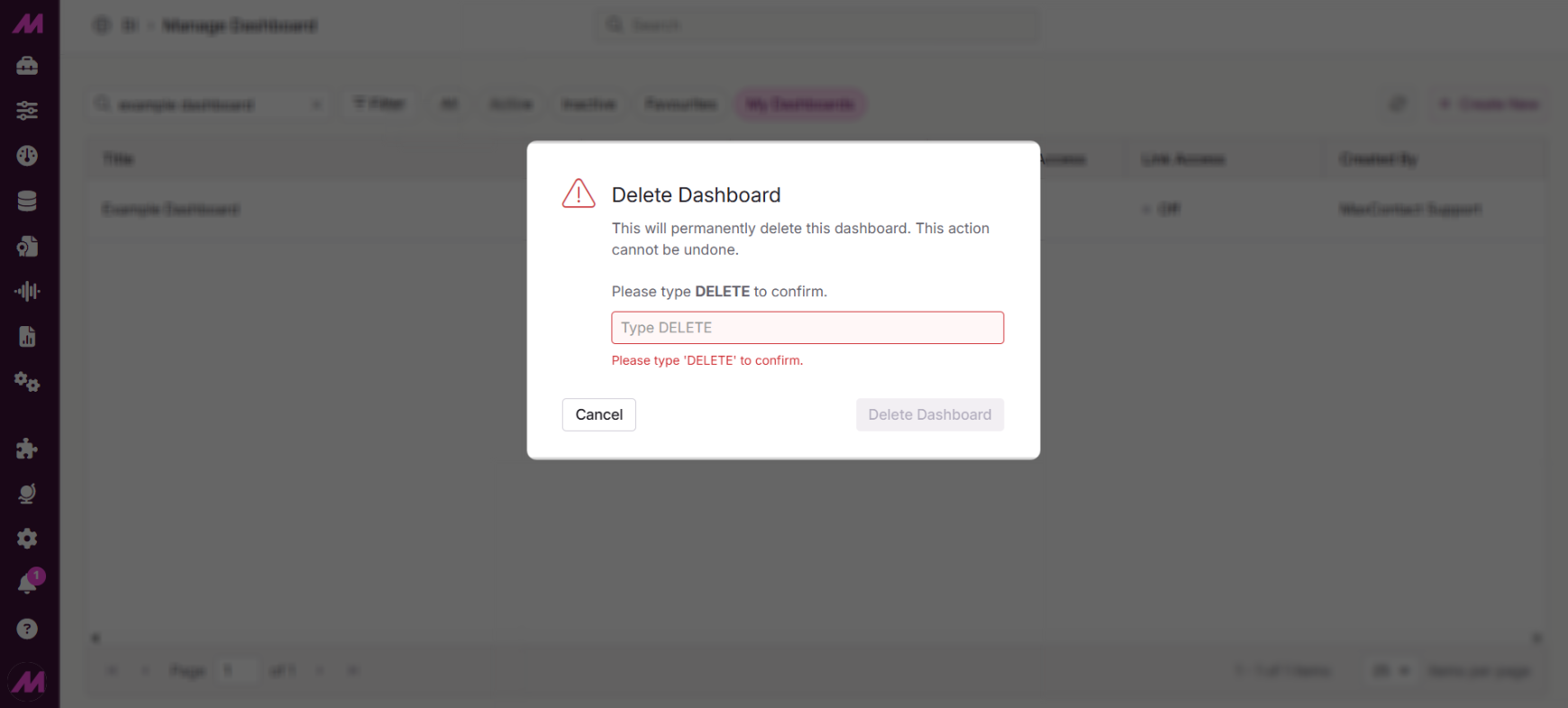 - A confirmation window will appear. Type DELETE in the field provided, then click Delete Dashboard to confirm.
