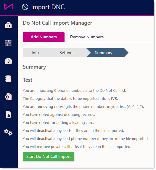 Once you are happy with the summary, you can then start the import by clicking 'Start Do Not Call Import'. After clicking this button the import will begin and your numbers will be added to the DNC list selected.