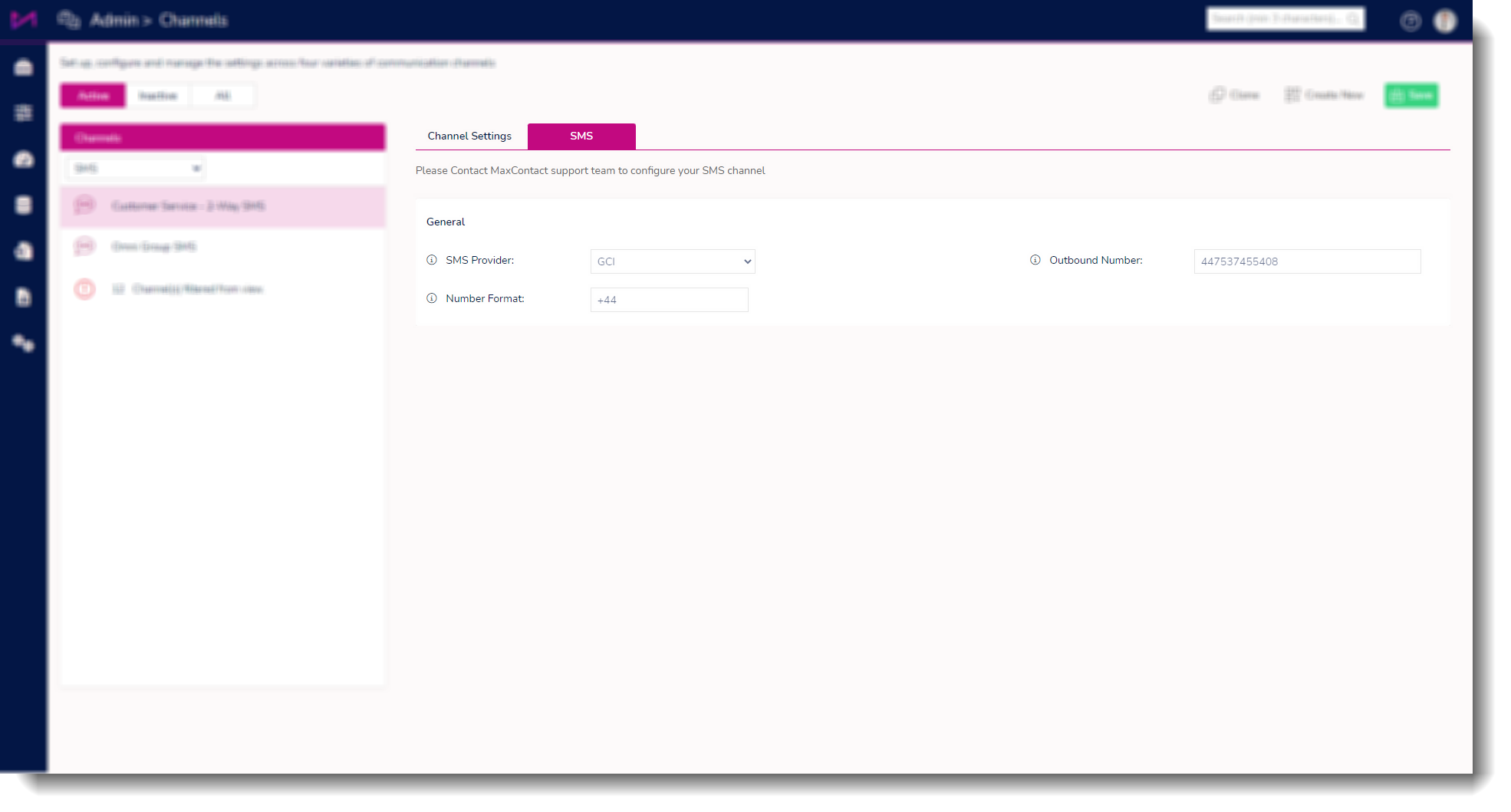 SMS has 2 tabs to configure each one consisting of cards with settings related to the channel.