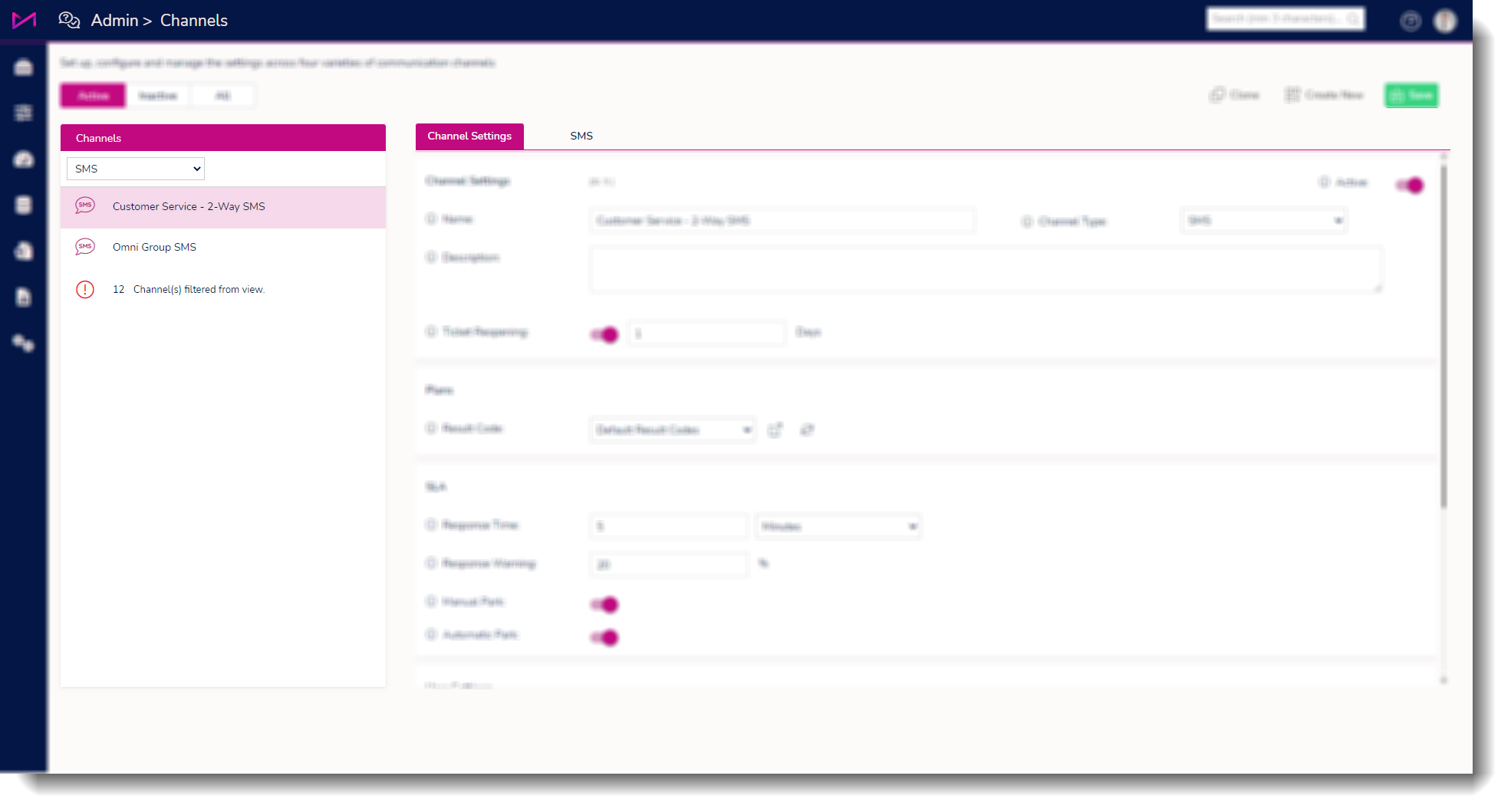 Fig 1. SMS channels filtered and tabs available for the SMS channel visible.
