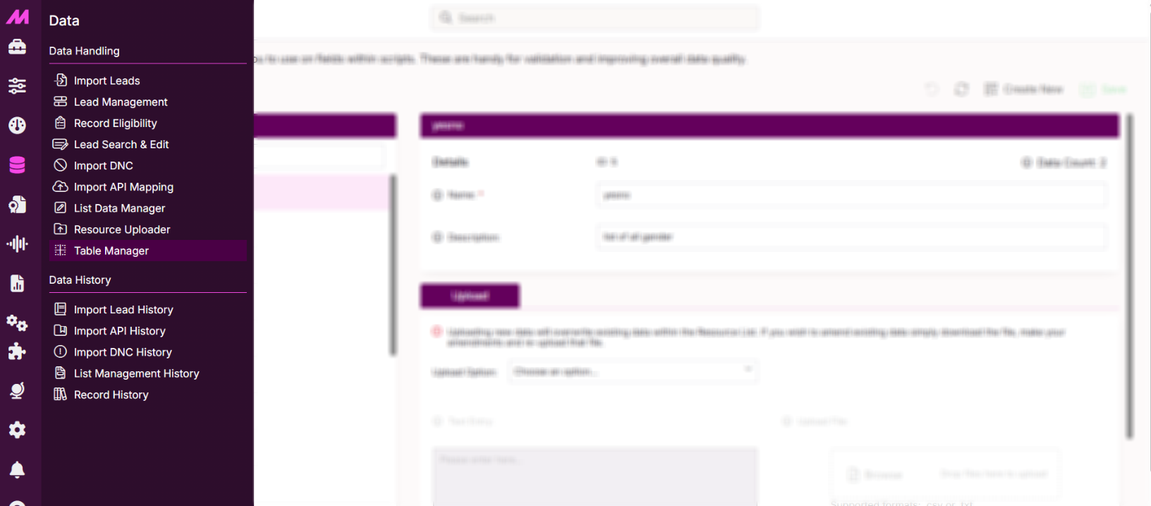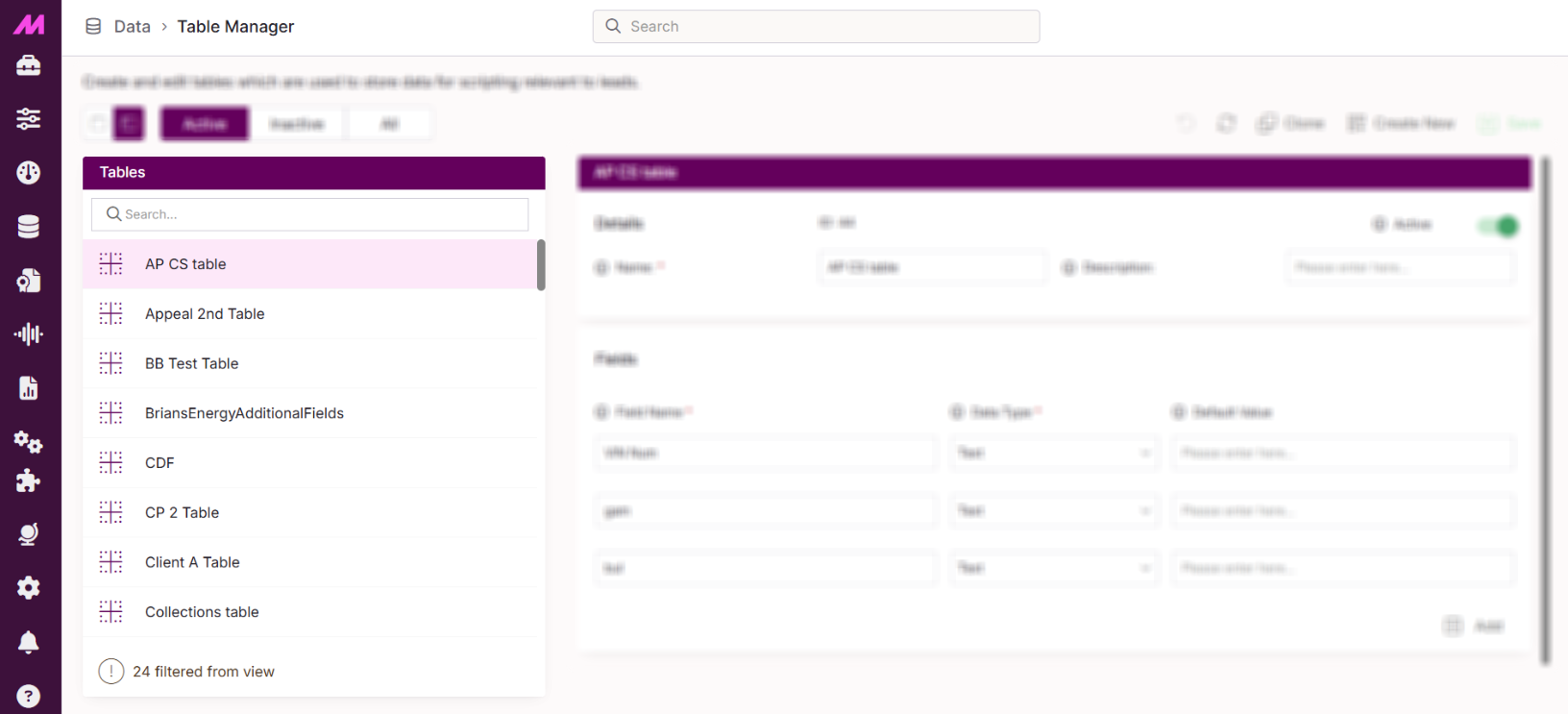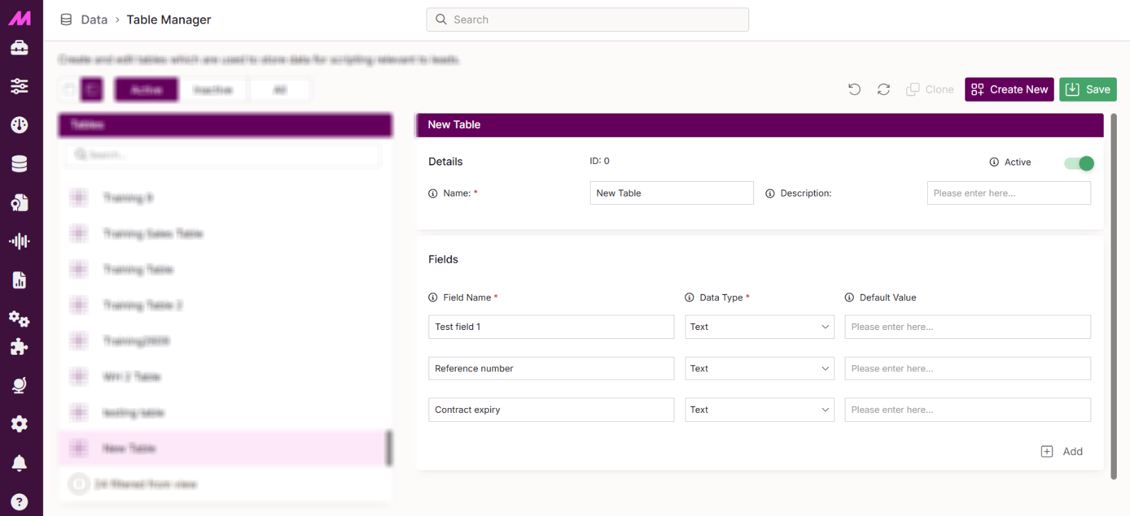 Tables in MaxContact are used to house data for scripts, custom data fetching, list management rules and more. The fields are areas for information/data to be inputted, which in turn are registered to a lead in the database. Fields can be created for any information required such as DOB, contact details, contract expiry, favourite ice-cream or any number of things.