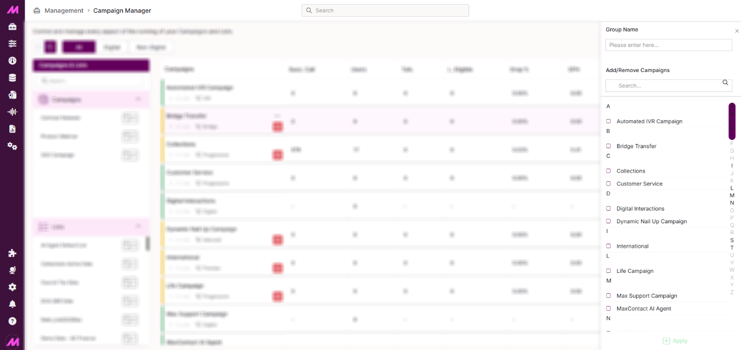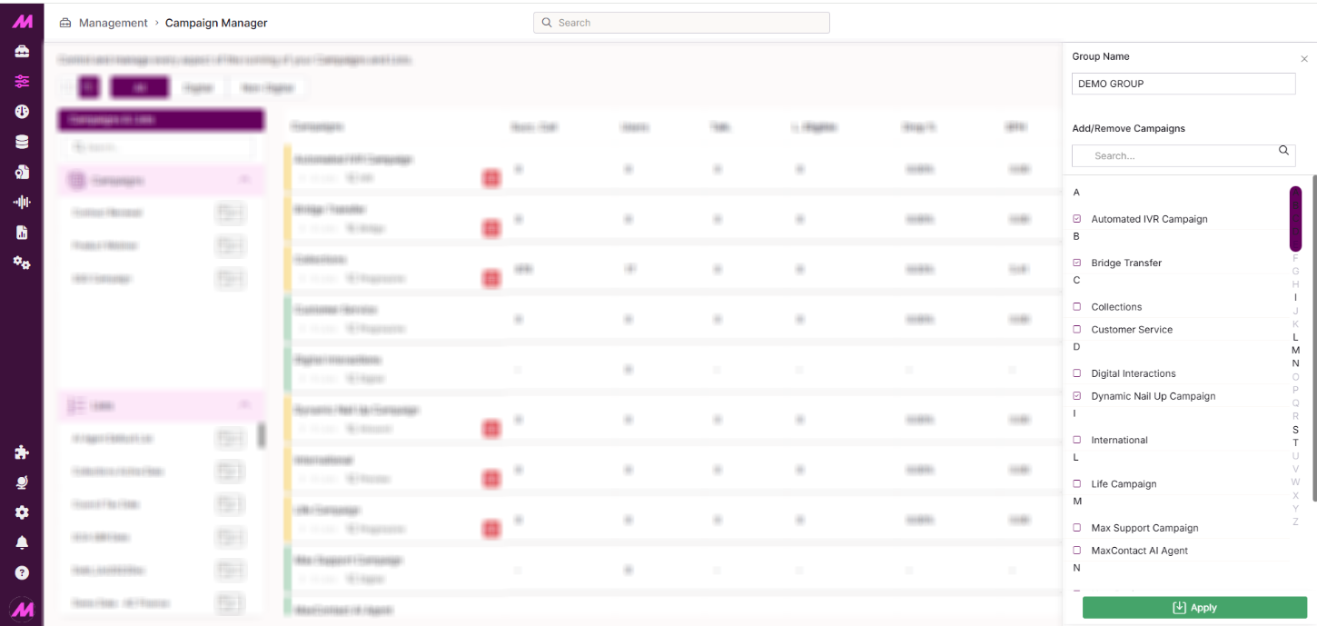 | Selecting this option opens a panel on the right-hand side of the screen where you can select multiple campaigns to combine them into a group. By entering a name for the group and selecting the campaigns you wish to include, the 'Apply' button will appear green, allowing you to create the group. | ![]() |
