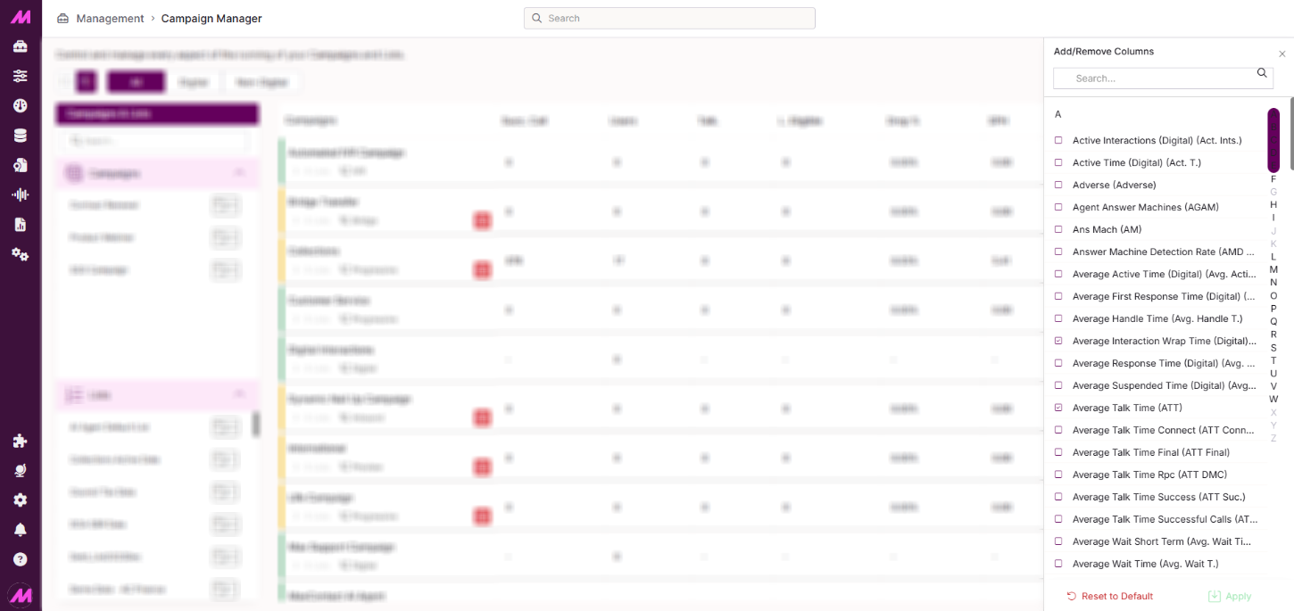 | Selecting this option opens a side panel with over 100 statistics to choose from. Simply select/deselect the statistics to add/remove them within grid (Newly added stats will appear at the end of the grid). To quickly find the stat you want, start typing in the search box and it will bring up all partial and full matches in the list. Once you are happy, hit 'Apply' to action the changes. | ![]() |