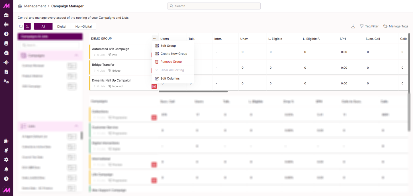 There are several features that can be actioned within the first column of the grid. These are, Campaign Grouping and Editing Stat Columns.