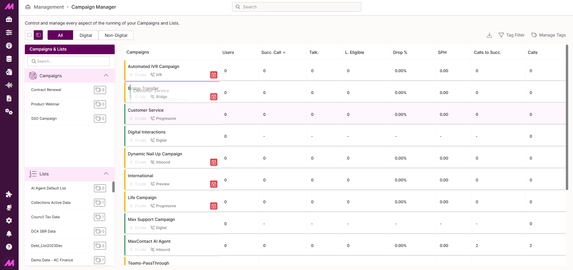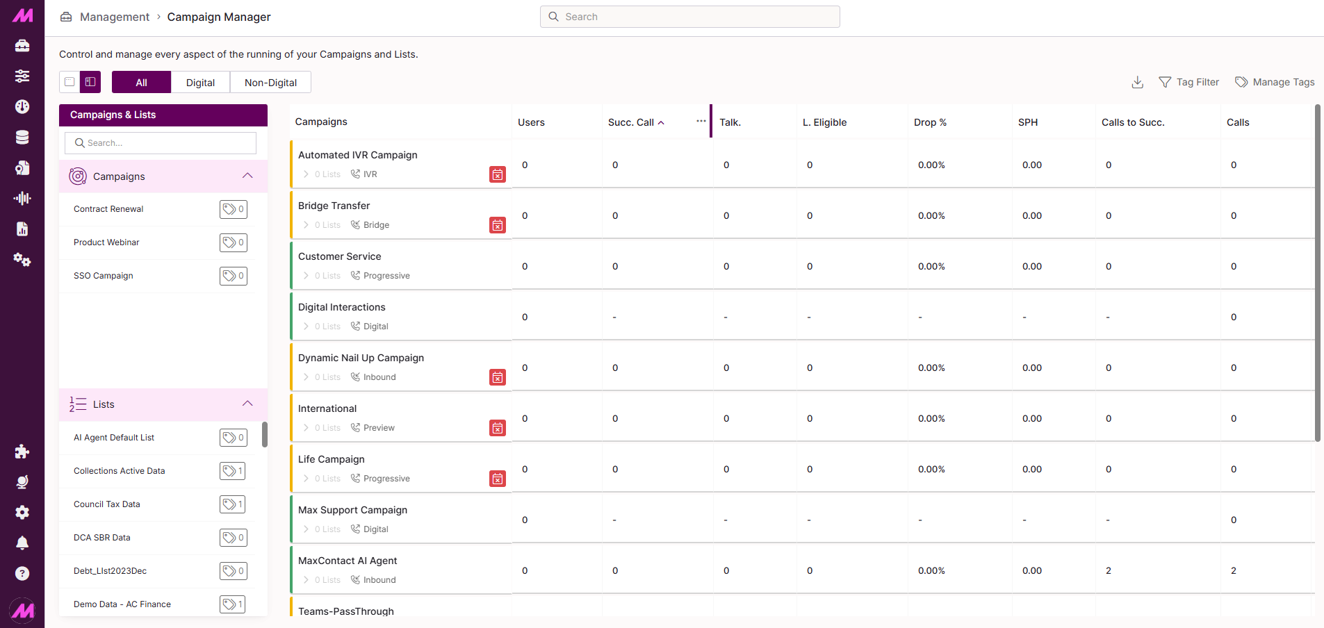 Calling campaigns will only dial leads if there are agents logged in and ready. An interaction campaign (containing webchat, email, SMS channels) will only pull through interactions if agents are logged in and ready. Otherwise, the campaign will be running but not actually calling/interacting with leads. | ![]() |
