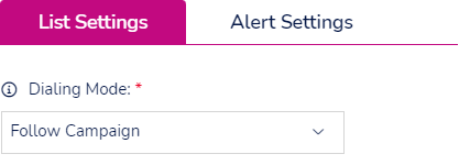 ![]() | Select which dialling mode you want this list to follow when it is added to a campaign. If you select 'Follow Campaign Type' the data in this list will be dialled the same as the campaign e.g. predictive, progressive, preview. If you select 'Preview' all data in this list will be dialled in preview no matter how the campaign is setup. |