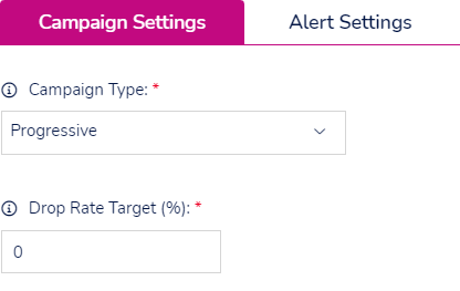 ![]() | Progressive Choosing this option means the system will dial one lead per user but also allow inbound calls to come in. This option allows you to set the following; Drop rate target. Once set, the platform will compare the Drop Rate Target against the actual Drop Rate and adjust its dialling speed accordingly. If the current Drop Rate exceeds the Drop Rate Target the campaign will slow down the number of outbound calls being made in an attempt to be at or under the set Drop Rate Target. You can set this between 0% and 100%. Generally you should not get dropped calls with a Progressive campaign but the option to set the drop rate target is there for the rare chance you do.Access to this feature is based on a the permission 'Drop Rate Settings'. |