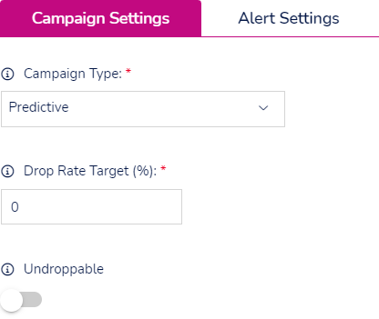 ![]() | Predictive Choosing this option means the system will dial multiple leads for each user and distributes the answered calls to available users. Should there not be enough available users, calls will be dropped. You should ensure you have a minimum of 6 users for this type of campaign. This option allows you to set the following; Drop rate target. Once set, the platform will compare the Drop Rate Target against the actual Drop Rate and adjust its dialling speed accordingly. If the current Drop Rate exceeds the Drop Rate Target the campaign will slow down the number of outbound calls being made in an attempt to be at or under the set Drop Rate Target. You can set this between 0% and 100%. Access to this feature is based on a the permission 'Drop Rate Settings'. Undroppable Toggle to enable/disable the undroppable algorithm. Enabling will initiate an alternative dialling algorithm to keep the Drop Rate % as close to 0 as possible whilst still dialling predictively. Please note, when enabling this the Drop Rate Target % is bypassed. |