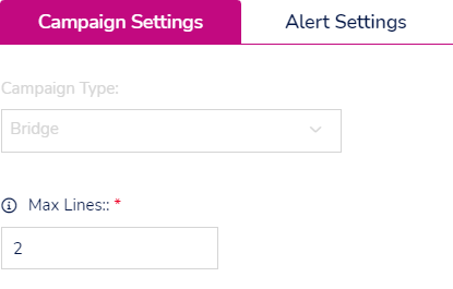 ![]() | Bridge The only option available for Bridge campaigns is to choose how many lines to use when transfers are made over the Bridge campaign, handy if you want to limit the number of concurrent transfers. Don't forget this is the maximum and other factors will influence the number of lines in use. You can set this between 0 and 999 Lines. |