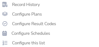 | Other settings | These are simply shortcuts to relevant pages within the product. Record History Configure plans Configure Result Codes Configure schedules Configure this list |