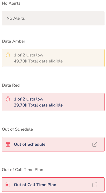 | Alerts | Will display any alerts that have been triggered and the information relating to the alert(s). This could include the number of lists low on data, the remaining list data, total data eligible for the campaign and the total filtered data eligible. When hovering over the alerts, you will see more information about the specific alert(s). |