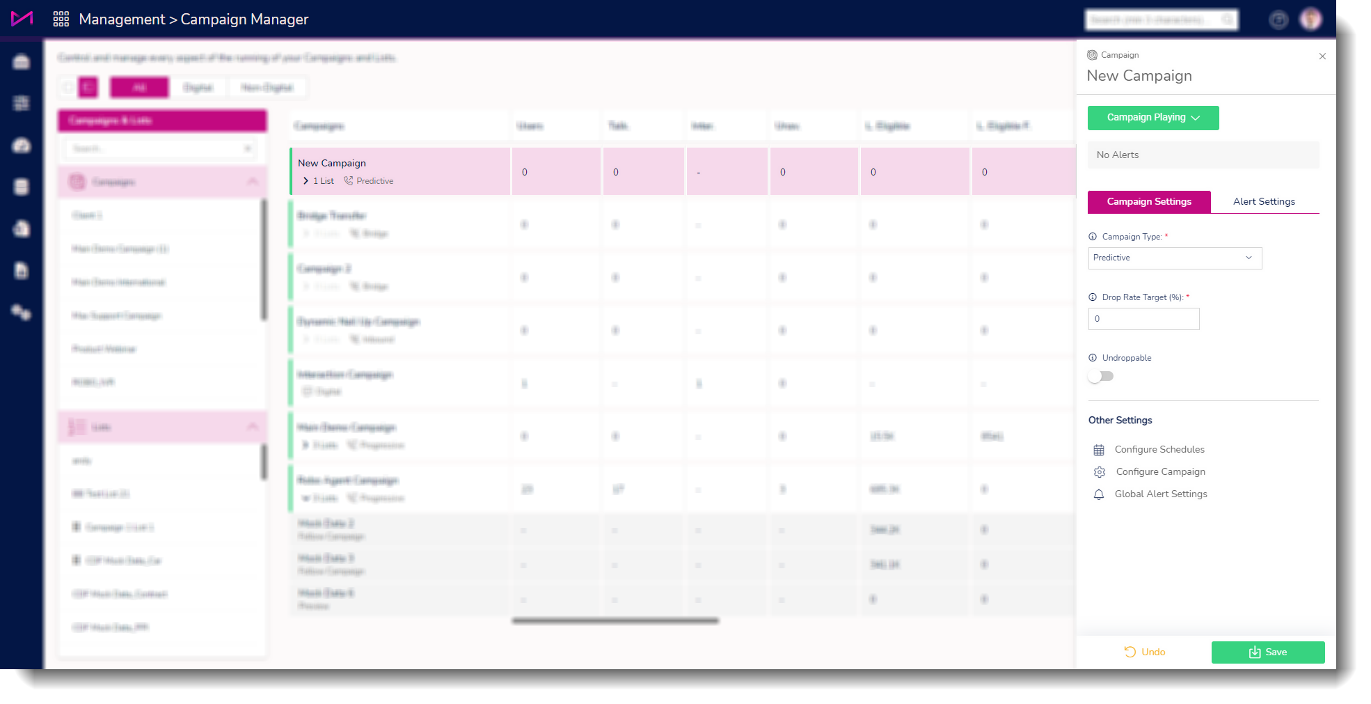 | Campaign Settings | Allows you to control how the campaign operates. For non digital voice campaigns, you can change the type of outbound dialling between Predictive, Progressive and Preview. |