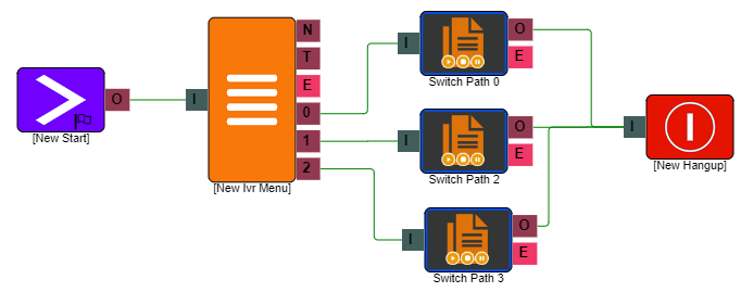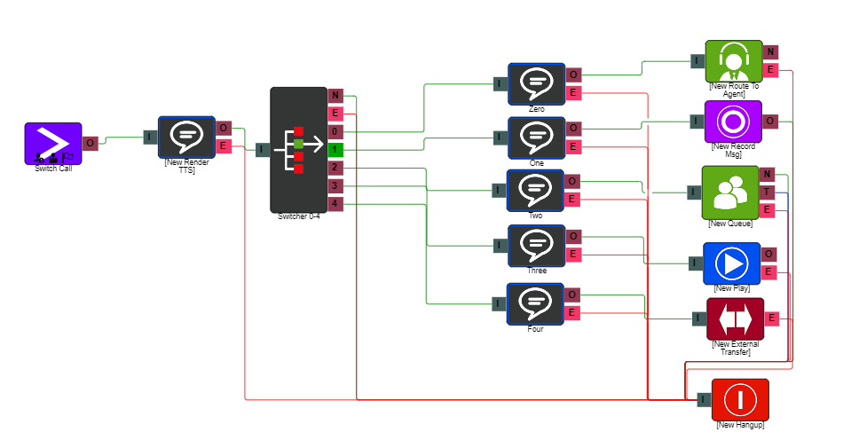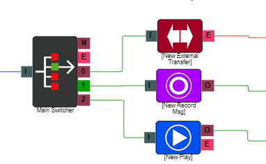 In the example below the "switcher" is connected to an "external transfer", "record message" and a "play" element however option 1 is highlighted as being in use so you would navigate to a "Record Message Option".