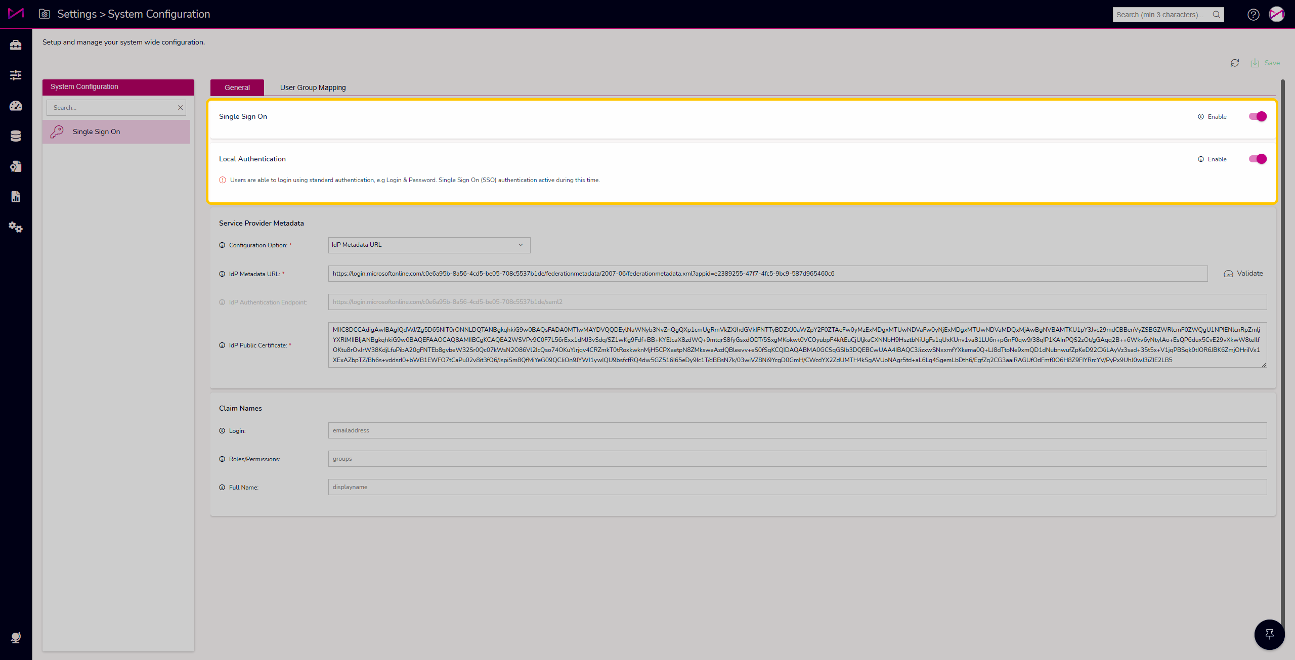 If you are setting SSO up, we recommend you turn on both SSO and local Authentication until everything is configured. Within the page, you can enable/disable SSO and can also enable/disable the use of the standard Local Authentication method - Username & Password from the CTU page. Local authentication is an override, we would advise you have this switched on until your SSO is completely setup. The idea is that when using SSO, if anything went wrong, you wouldn't have to turn it off for each user individually, you can just allow all users to access the system with the default login option. More on this later.