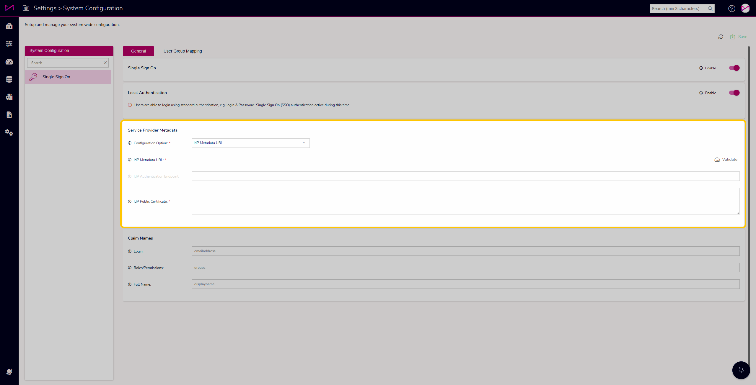 Once you have the required information from your team and/or MaxContact, you can then configure the system via the Service Provider Metadata card.