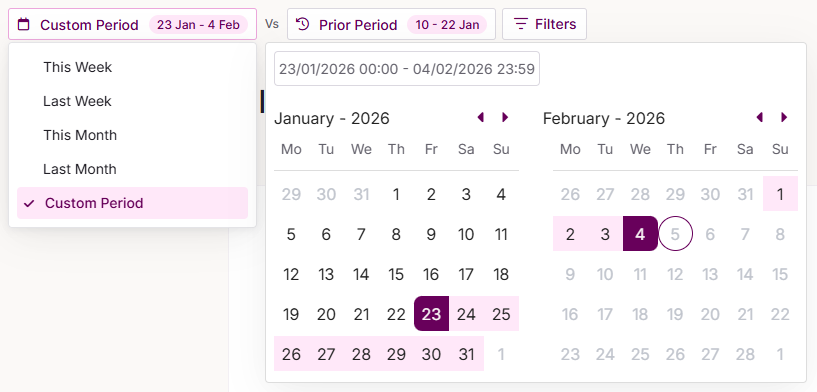 Custom period allows you to select a date range.