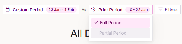 - Partial Period, the comparison is only made for the part of the current period that has already occurred (e.g, the first 3 days). This lets you compare real progress so far, rather than projecting or using incomplete data.