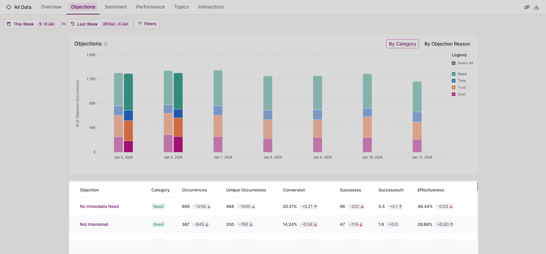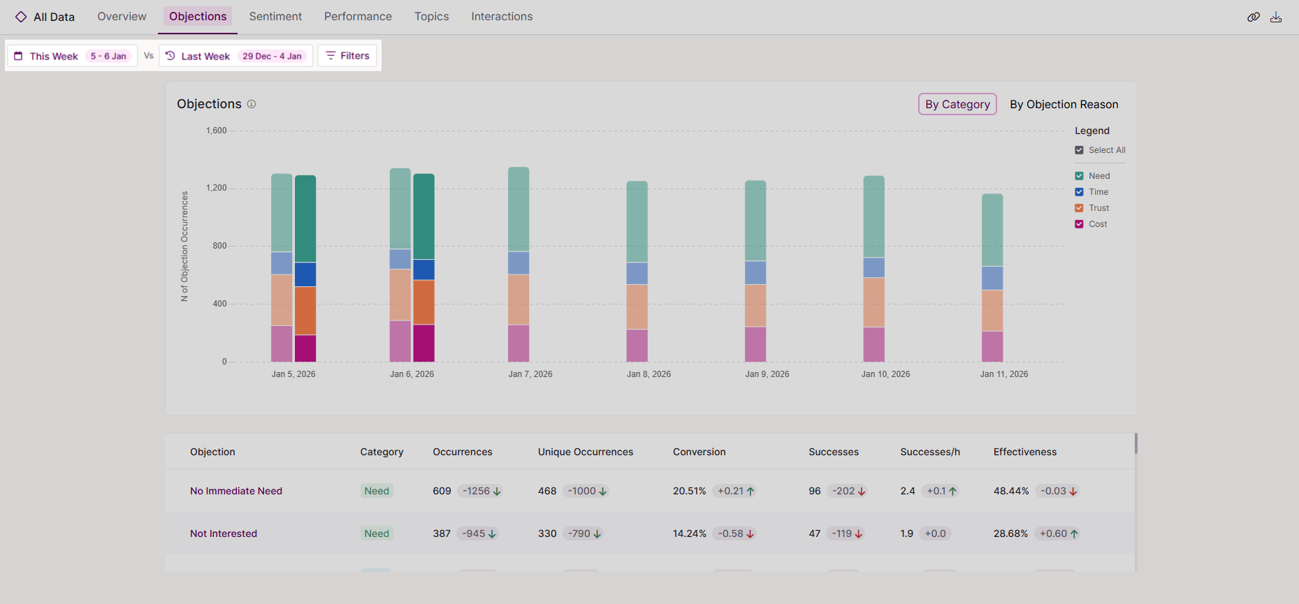 Unique Occurrences - The number of individual calls in which the objection was detected. For example, there may be 10 total occurrences of an objection, but only 2 unique occurrences if it appeared 4 times in Call 1 and 6 times in Call 2.