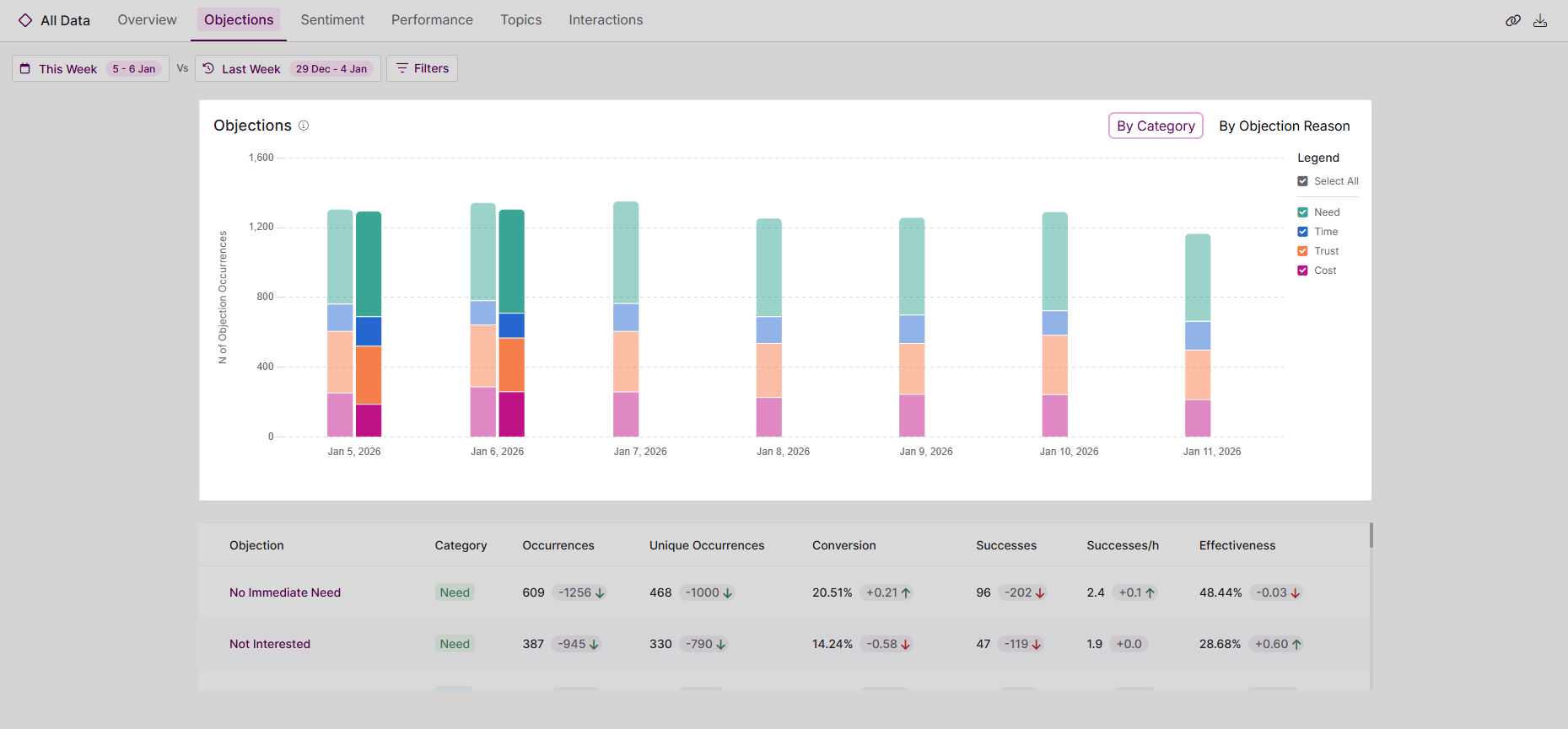 Hovering over a segment of the chart reveals more detailed trend analysis and provides the option to View Interactions, allowing you to review the specific calls associated with the particular Objection Category or Objection Reason.