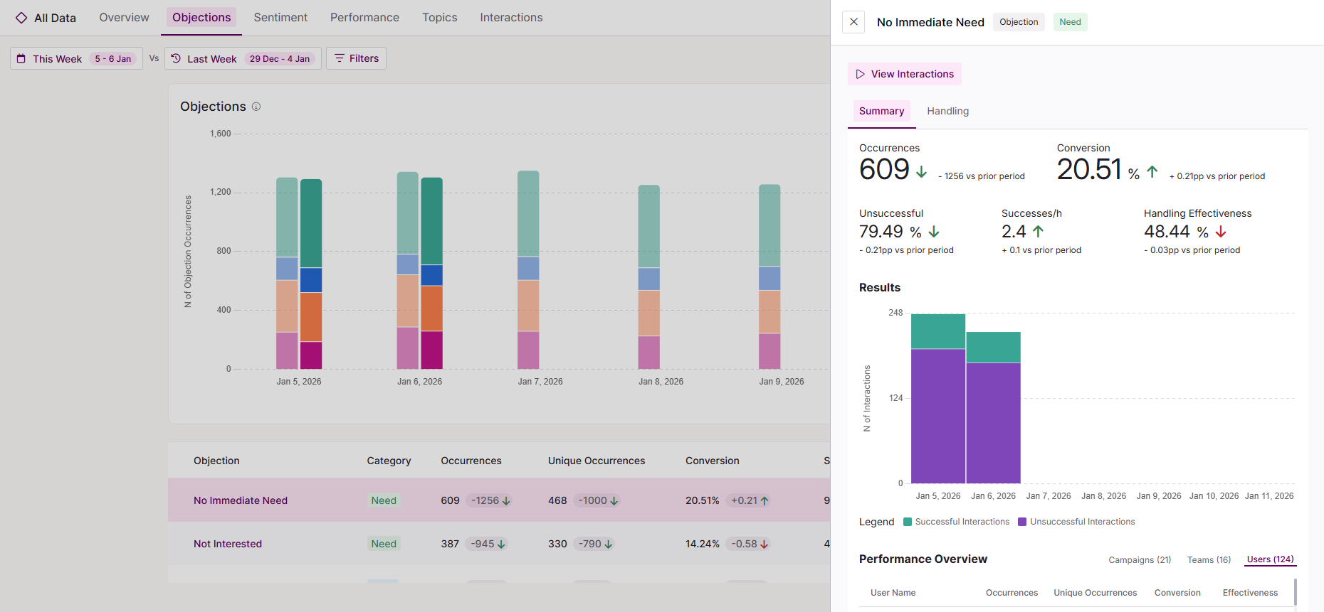 The Objections tab lets you review objections identified within interactions and see how effectively agents handle them.