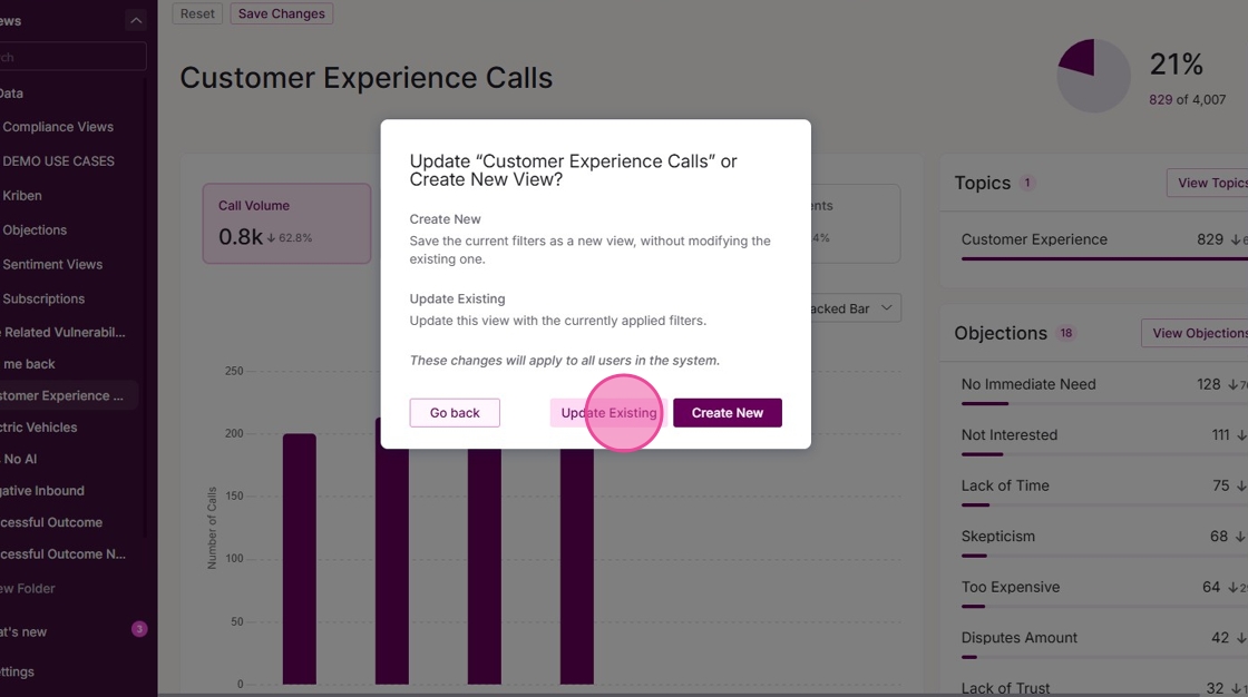 Selecting 'Update Existing' will overwrite the current view, with the newly applied filters.