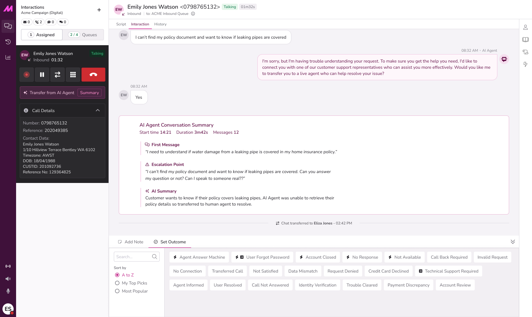 | When an AI Agent sends a call to someone logged into Contact Hub, your agents now get a clear view of what happened earlier in the conversation. They can see the transcript, summary, escalation point and call duration, which means callers don’t have to repeat themselves, and agents can step in with confidence. You can switch this feature on or off, and all previous AI interactions are now saved in My History and Contact History so your team can quickly pick up the full story whenever they need it. | ![]() |