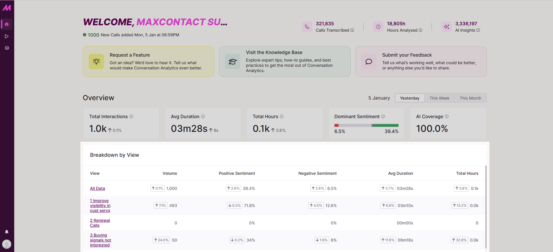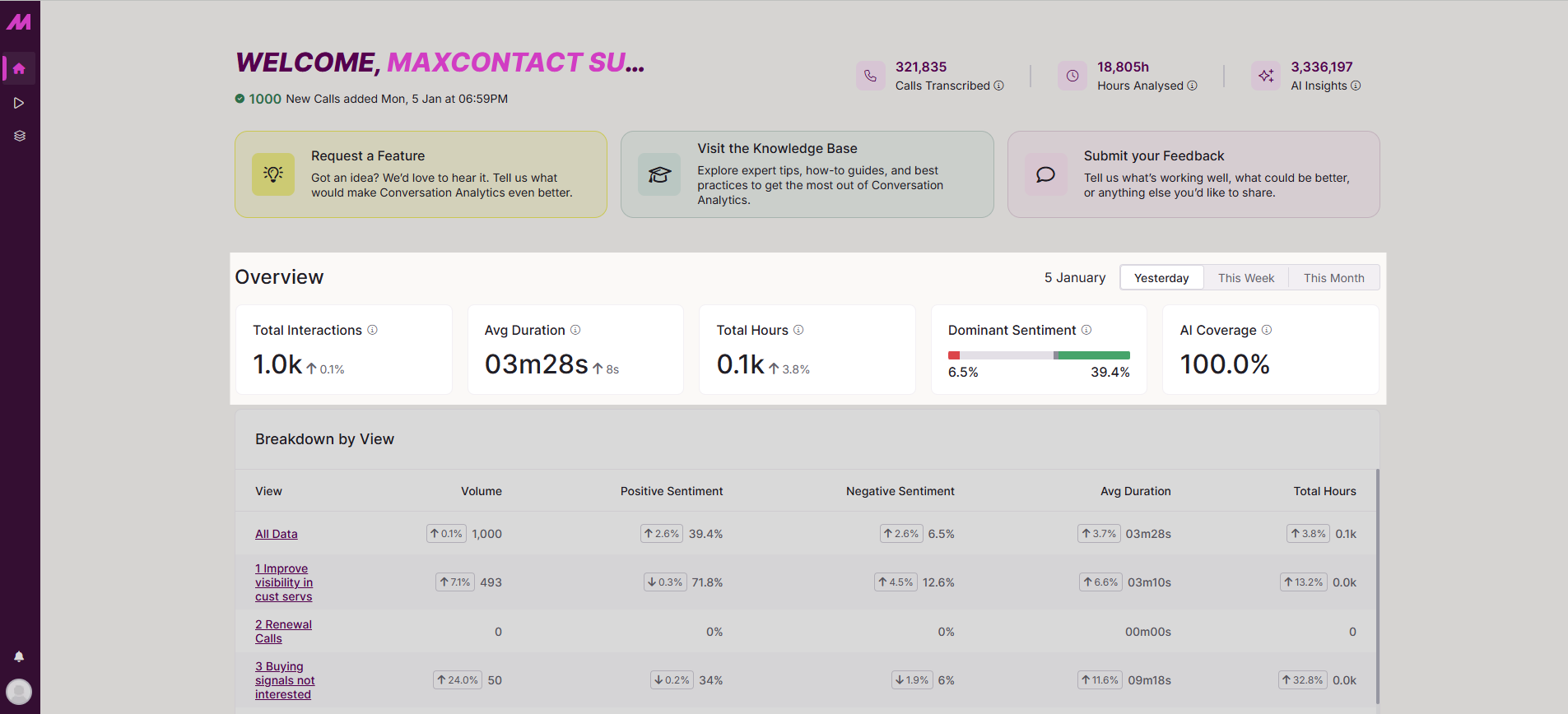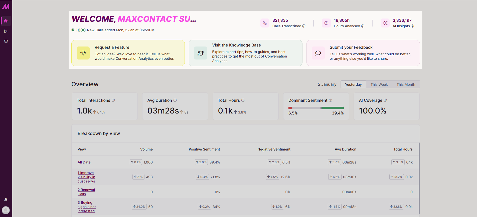 The Welcome section gives you an at-a-glance view of how Conversation Analytics is performing. It shows the total number of calls transcribed, the total hours analysed, and the amount of AI-generated insights across those calls.