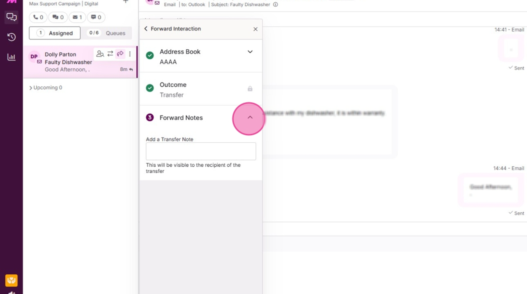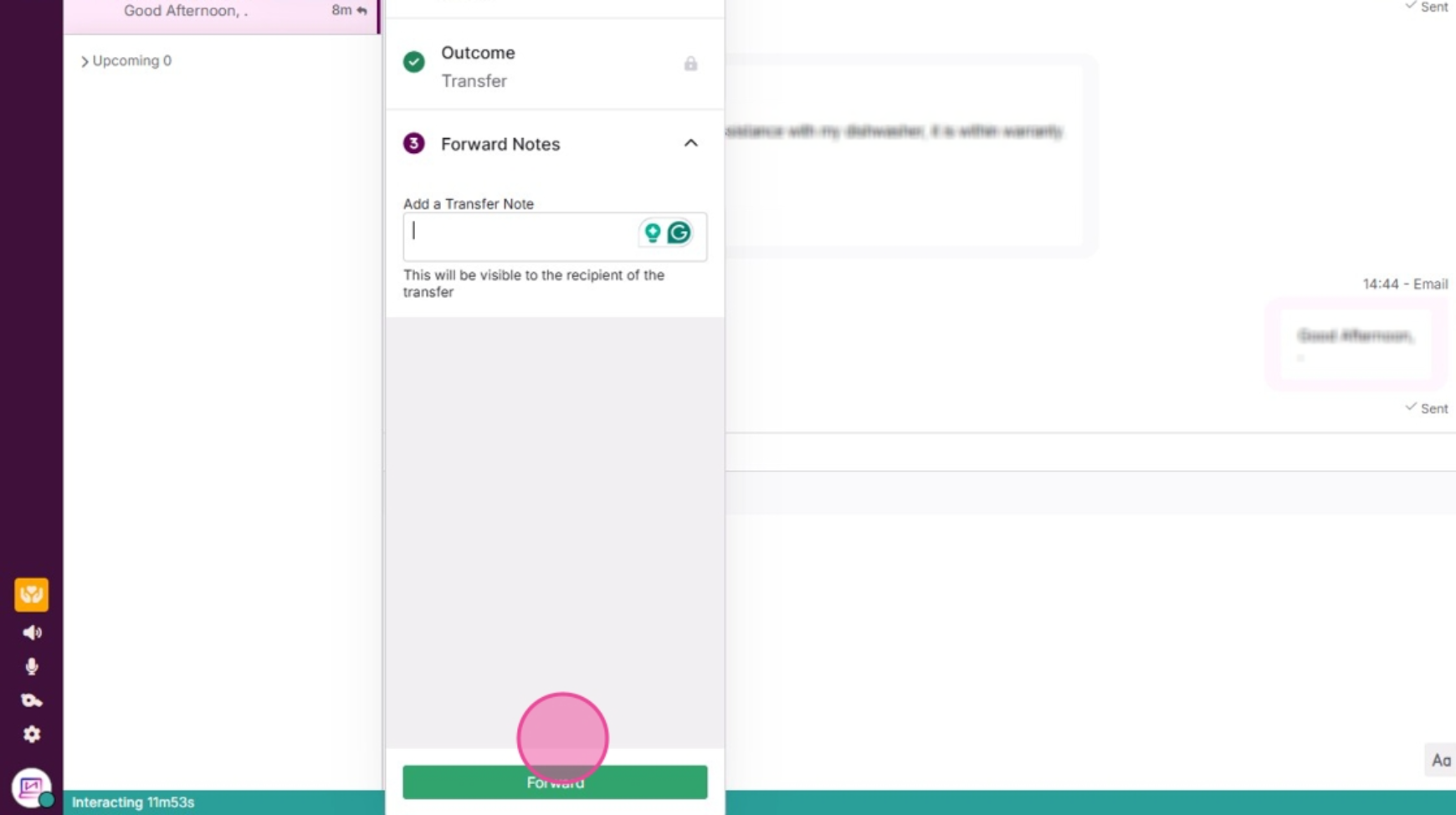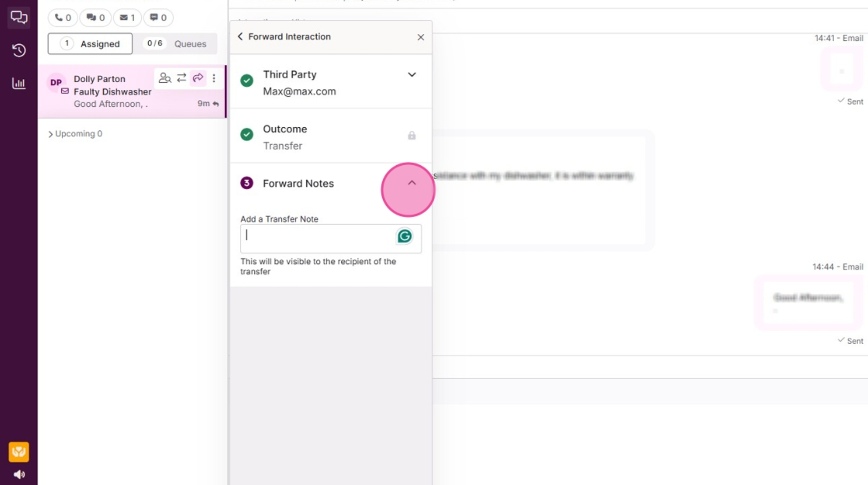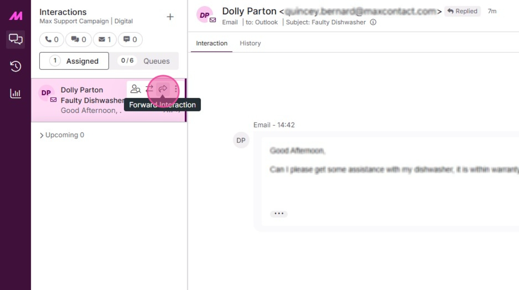 2. To begin the forwarding process, simply hover over the interaction to reveal the quick action buttons. Select the Forward Interaction button.