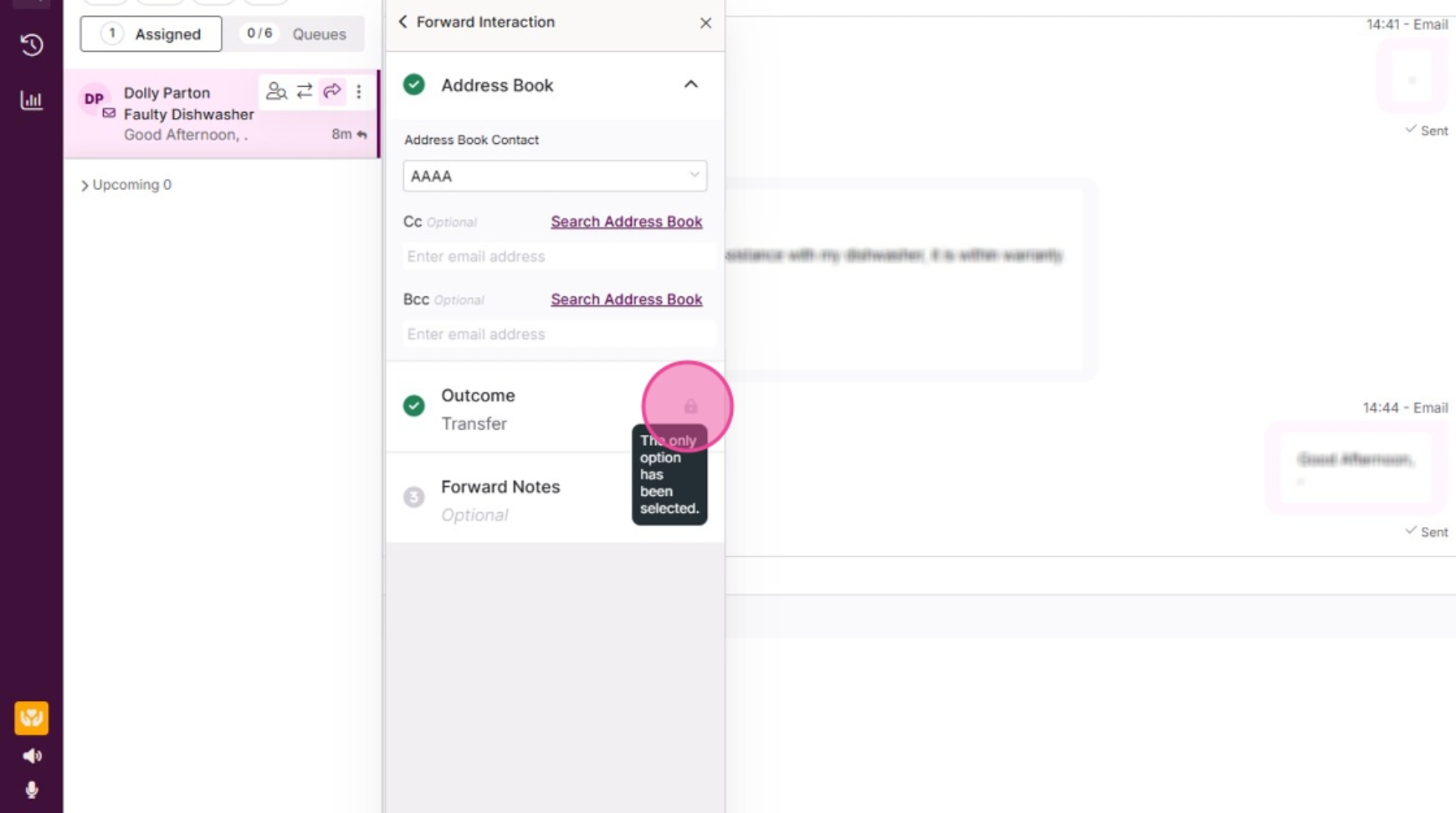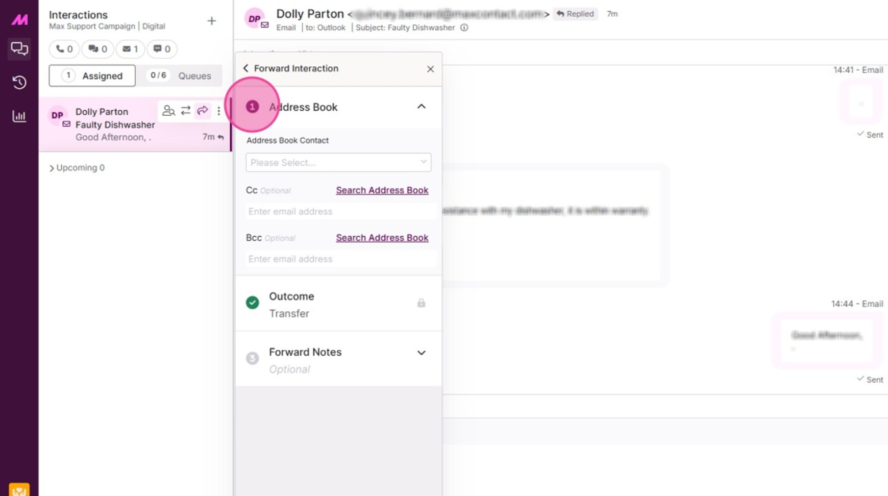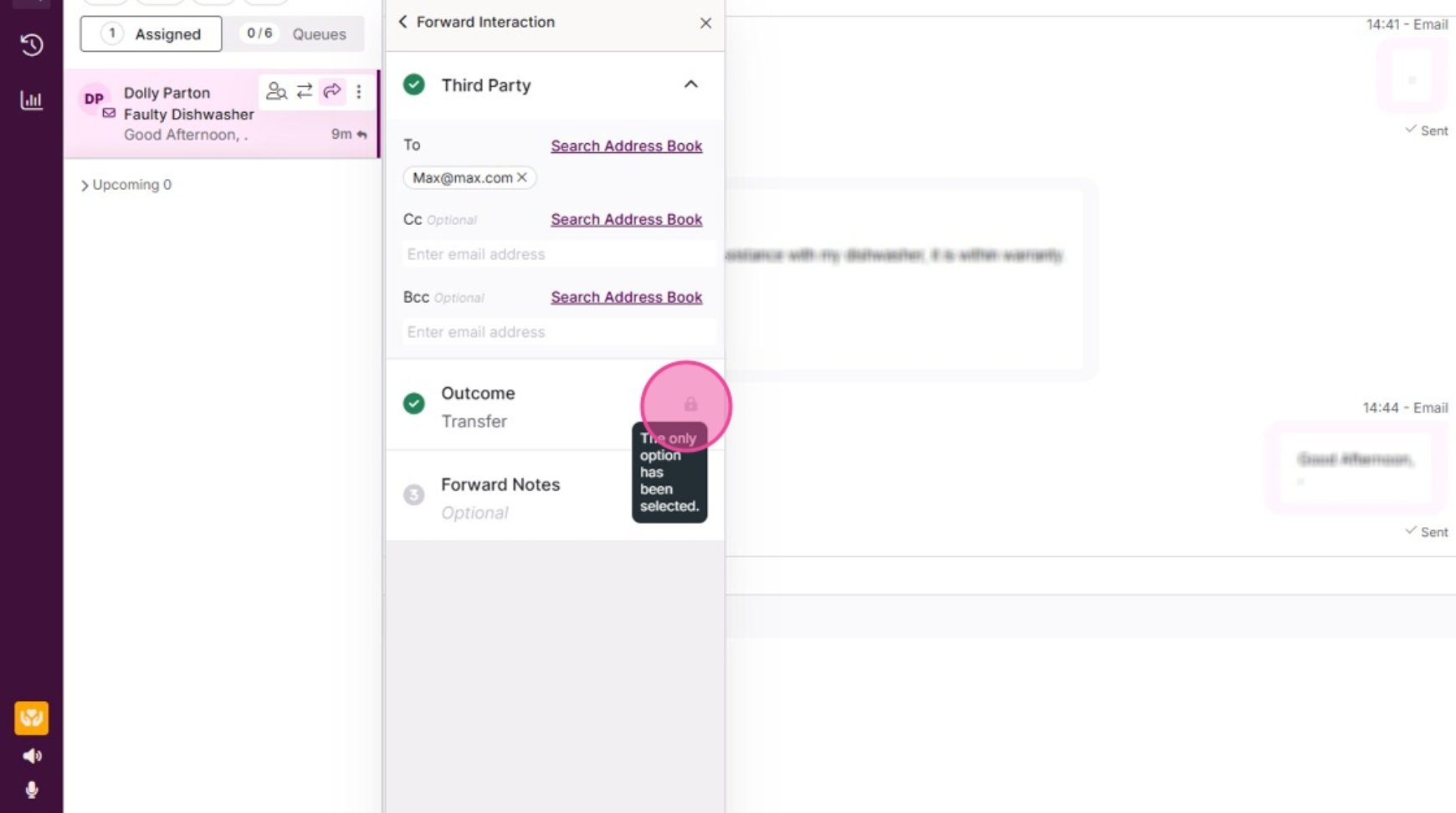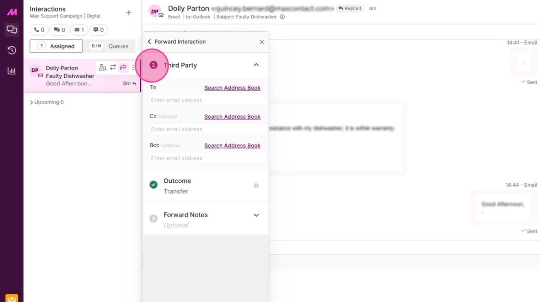 2. To begin the forwarding process, simply hover over the interaction to reveal the quick action buttons. Select the Forward Interaction button.