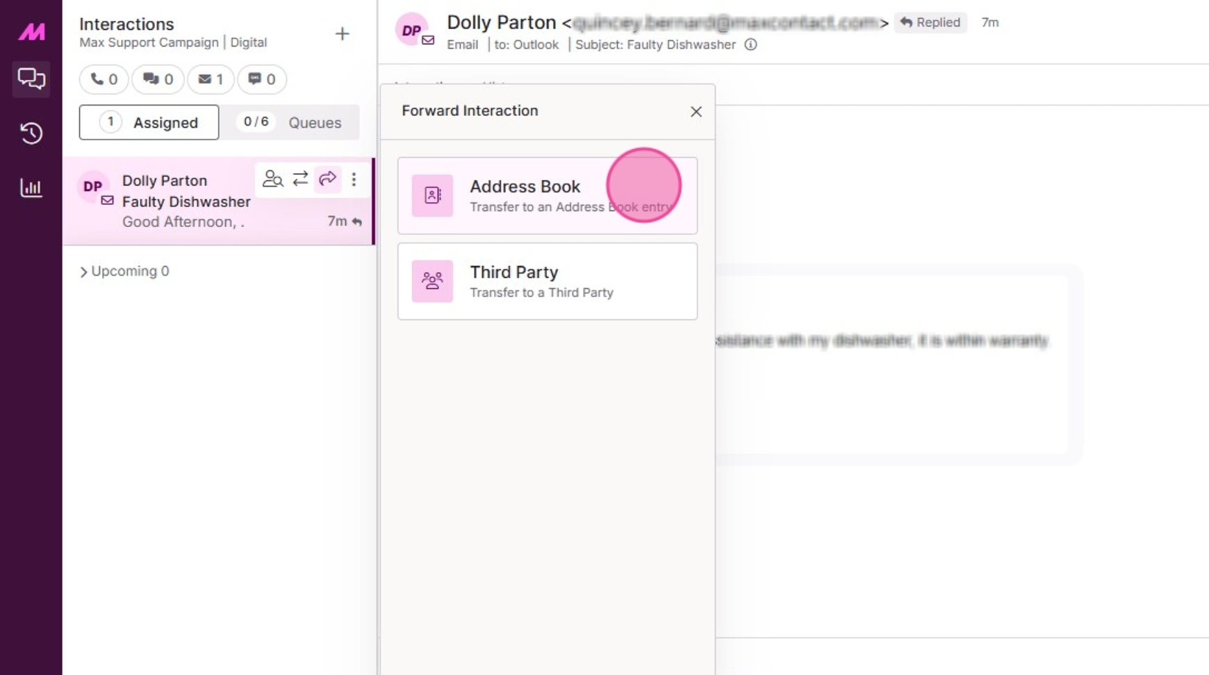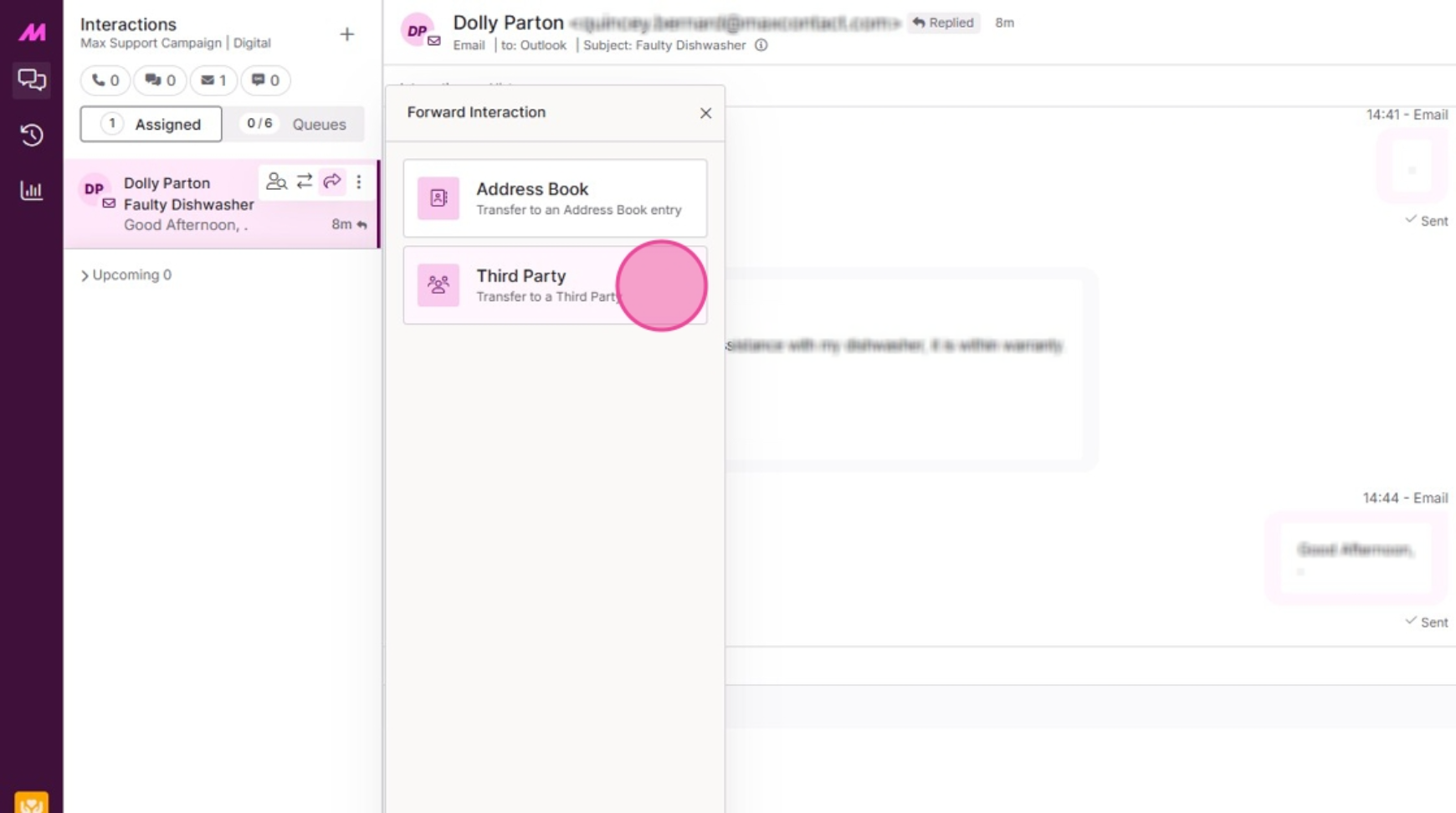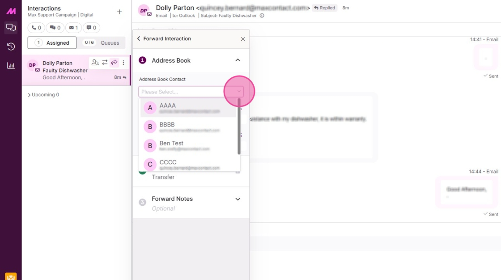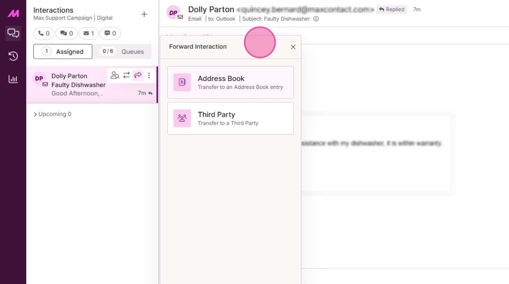 2. To begin the forwarding process, simply hover over the interaction to reveal the quick action buttons. Select the Forward Interaction button.