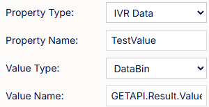 | Value Name | The value source from within the IVR. Utilises the following layout Name of API Request Element.Result.Item name from API Body So for this example we would utilise GETAPI.Result.Value |